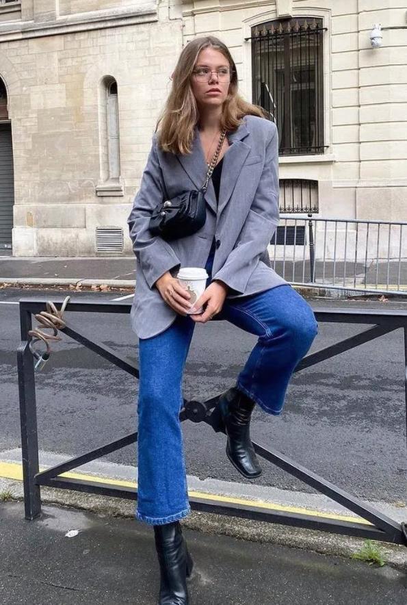 灰色的西裝外套,沒有黑色那麼顯沉悶,還能給人一種百搭高級感,內搭一件黑色吊帶衫,又將女性的魅力和小性感都詮釋出來了,搭配一條藍色牛仔褲,瞬間爲整個造型增加了幾分知性大女人的氣息,搭配一雙黑色短靴,輕鬆展現出女性的氣質和優雅。