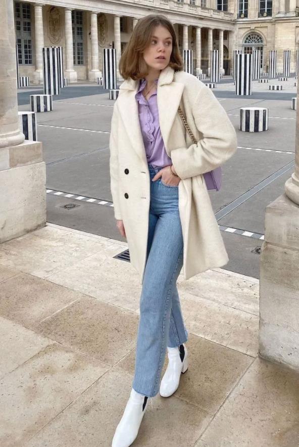 這種奶白色的雙面大衣,看起來也太溫柔了,內搭一件紫色襯衫,讓你瞬間展現出與衆不同的氣質,再搭配一條藍色牛仔褲,又將女性的獨特魅力和風采盡顯,腳下踩着一雙白色短靴,低調不張揚,還顯得很率性利落。