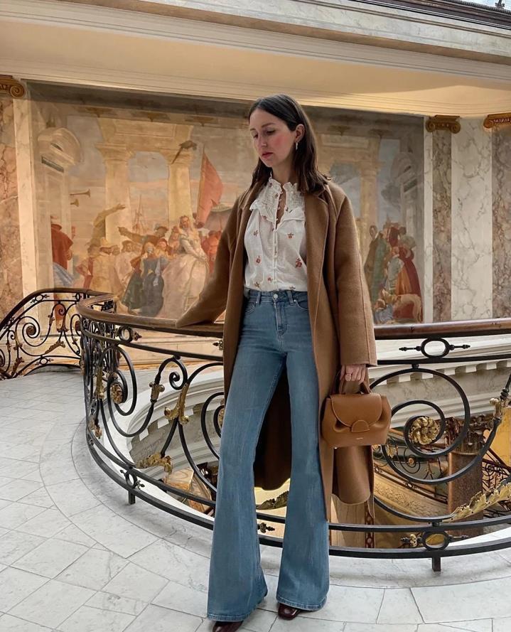 咖色的大衣,這個長度只到過膝的位置,能輕鬆打造出高挑感,內搭一件碎花襯衫,讓你個人的氣質和魅力都增加了不少。搭配起一條牛仔微喇褲,腳下再配上一雙方頭短靴,增添了幾分復古氣息,又在視覺上拉長腿部線條。