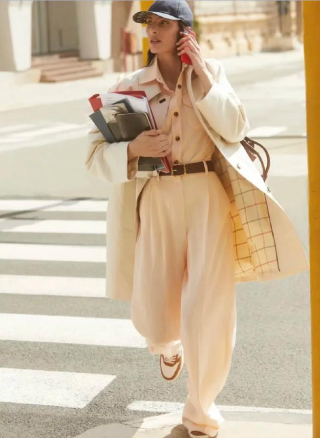 喜歡咖色風衣的,就不要錯過這麼一件,內搭卡其色西裝闊腿褲,這樣的搭配蘊藏着力量感和高級,選擇一雙厚底運動鞋來配,輕輕鬆鬆就穿出了高級和休閒氣息。