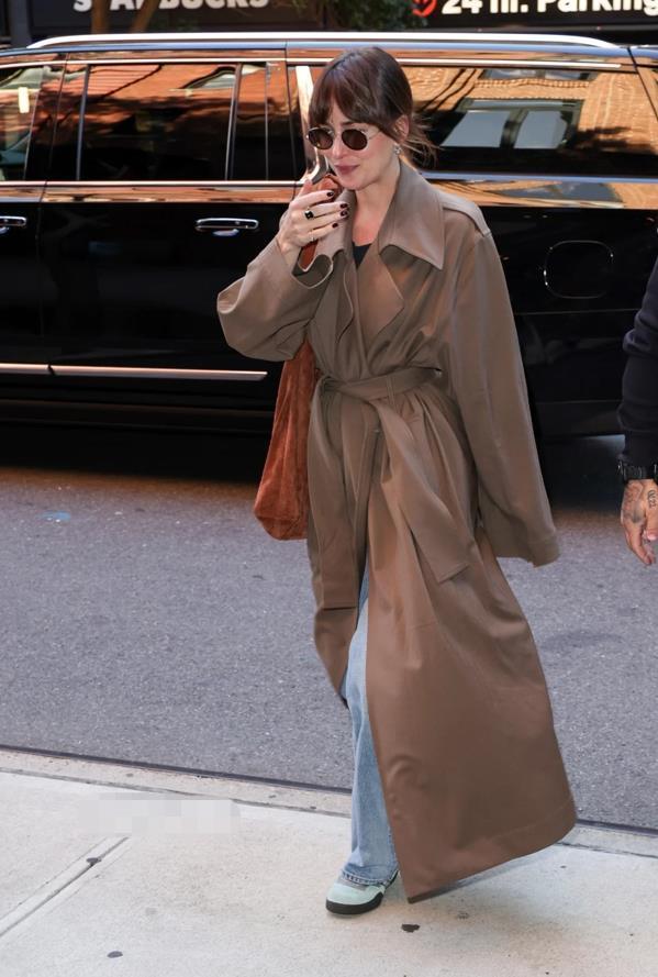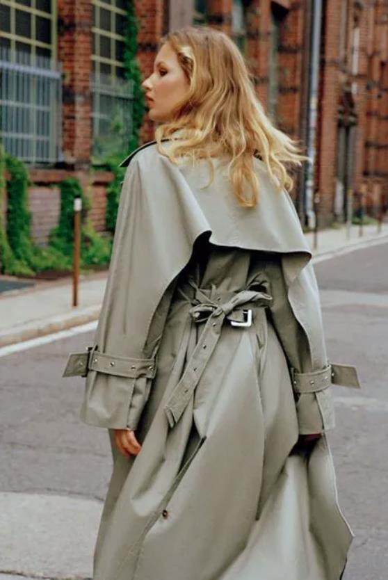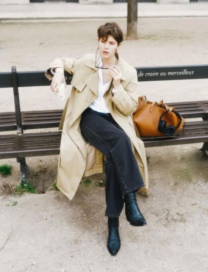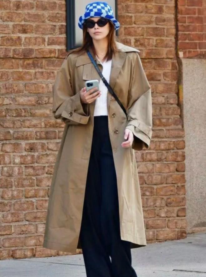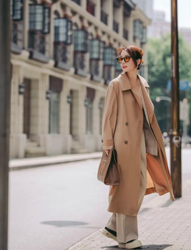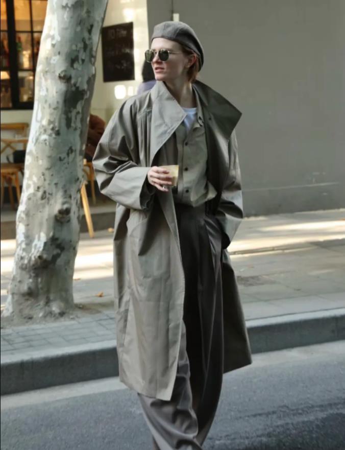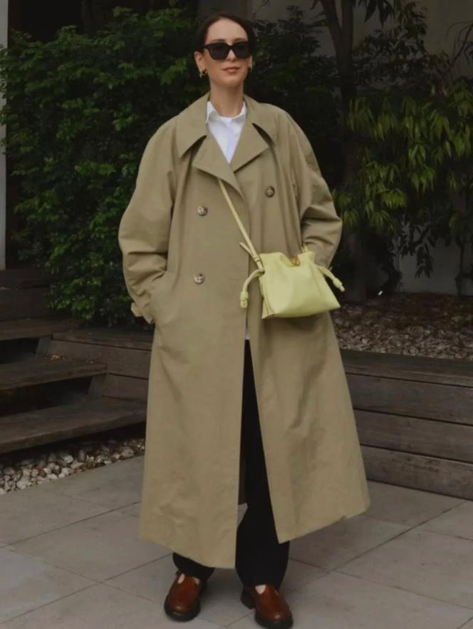 這種低飽和度的淺卡其色風衣,對於膚色是沒有一點違和感的,再加上這個顏色也非常顯氣質,內搭一件白色襯衫,就呈現出很時髦且不容易過時的造型,養眼又富有品味。搭配一條黑色闊腿褲,腿粗、腿型不好看的也不用怕了,氛圍感直接拉滿的一套。
