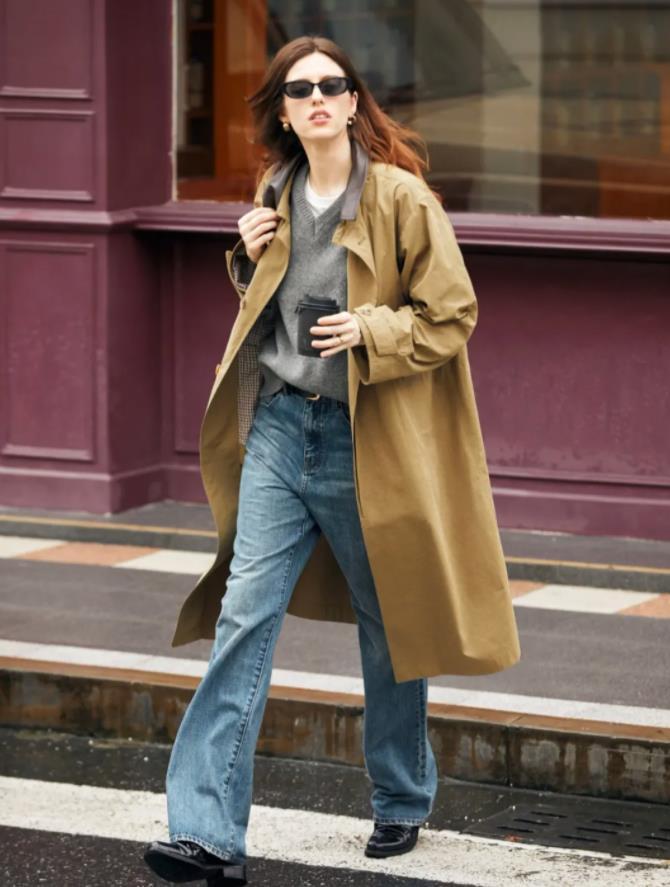沒有人會在這個秋天拒絕一件卡其色風衣吧?低飽和度的淺卡其色,對於膚色可是一點違和感都沒有,搭配上一條藍色牛仔闊腿褲,不僅能穿得很舒適自在,也可以巧妙遮掩住腿部的缺點,這樣的組合,能很好映襯出個人的美,更能毫不費力展現出大女人的自信。