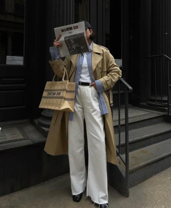 都說卡其色是最能代表秋天的色調,我覺得這麼說一點也沒錯,淺卡其色風衣,內搭選擇了一件白色襯衫,整個造型就釋放出一種知性且大方的氣質,搭配上一條黑灰色牛仔闊腿褲,又爲穿搭注入了穩重的氣質,再搭配上一雙黑色靴子後,更是將女性的高級與氣質都呈現出來。