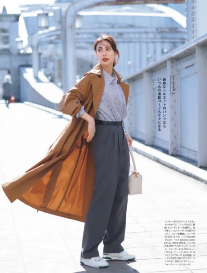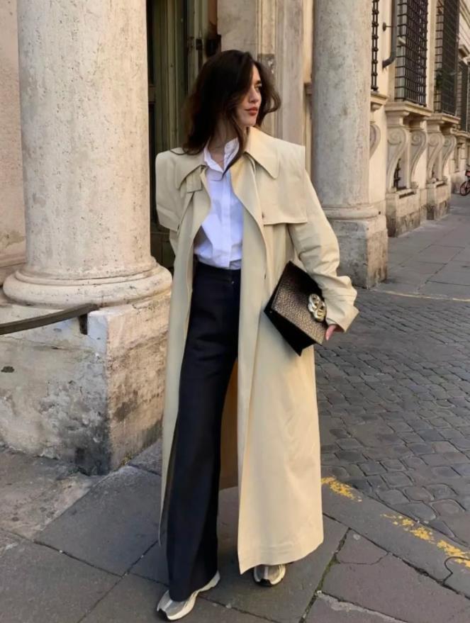 在秋天裏穿風衣,還是要儘量選擇長一點的纔好,內搭一件襯衫,簡單又不失個人氣質,這樣的搭配,既能展現出個人不凡的氣質,又很時髦。選擇一條與襯衫同色的闊腿褲,讓原本經典的造型,多了幾分活力,搭配一雙白色運動鞋,瞬間就能提升個人品味了。