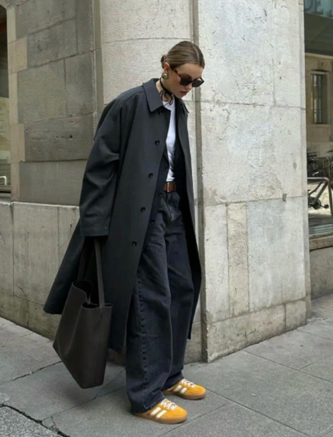 秋冬季節,風衣外套也是衣櫥裏最常見的單品之一,搭配闊腿褲來穿,輕鬆就能打造出高級大氣感,也可以幫助你修飾遮掩腿部的缺點,展現出隨性和氣場。