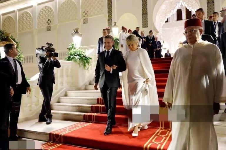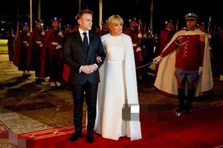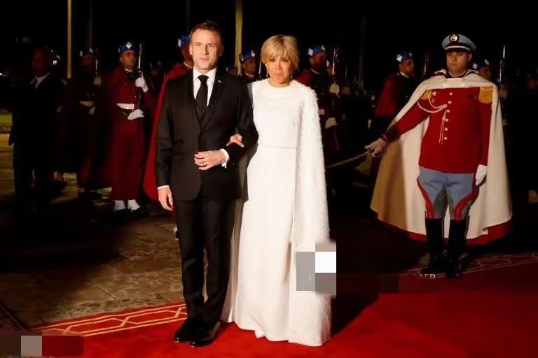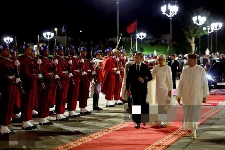 馬克龍帶着妻子布里吉特訪問摩洛哥,摩洛哥隊 國王和王儲們也熱烈歡迎。看地上鋪着的紅地毯、以及威嚴的士兵引路,就可以感受到那一份莊嚴。