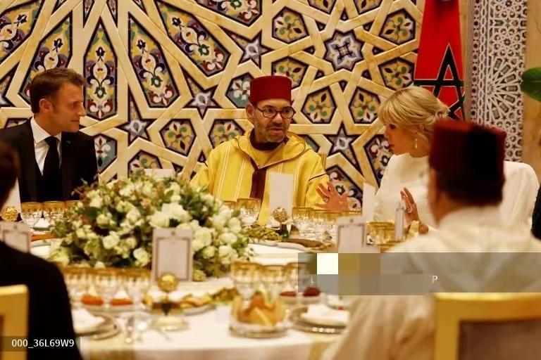 摩洛哥國王爲了迎接馬克龍福氣,也準備了豐盛的宴會。看這金碧輝煌、富麗堂皇的裝飾,就能感受到摩洛哥王室的貴氣。