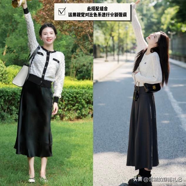並且這樣的穿搭組合完全可以運用對比的色系,例如像非常基礎百搭的黑白對比,在視覺上的強烈分割性就很明顯,又或者是冷暖色調以及不同的深淺色調的組合搭配。下半身的話也推薦各位可以將低跟鞋或者高跟鞋來進行入選,不僅優雅得體而且可以拉長我們下半身的比例狀態。