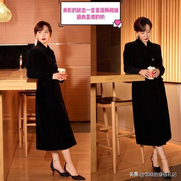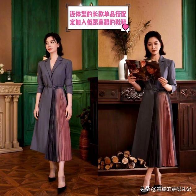 在四五十歲中年階段的時候單品的運用,首要注意的就是強調我們身形的一些優勢,對於陳數而言,在秋冬季節,他往往更喜歡搭配一些連體型的單品,看起來更加的具有流暢感,在這個時候就會加入腰帶的元素以及搭配低跟或者高跟鞋這樣的增高型鞋子。