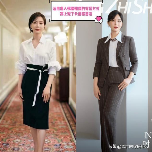 那如果最終的呈現是屬於上下系列的穿搭的話,就建議各位女性完全可以多多的運用塞褲腰或者是裙腰,這樣的穿搭方法將上短下長的標準比例自我營造出來。這樣的身材優勢在視覺上不僅非常的顯高,而且利落和高級感也是由此而發的。