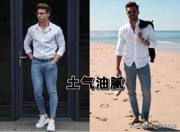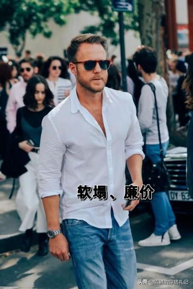 首先我們應該明確一點,無論襯衫還是牛仔褲都屬於最經典百搭的款式,這也說明它們在時尚表現力上要更弱一些,兩兩組合在一起,很難穿出吸睛感,加上發福的身材,分分鐘給人油膩土氣的感覺。所以建議過了40歲的男性儘量少碰這樣的組合。