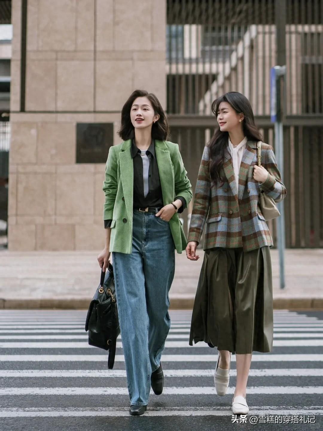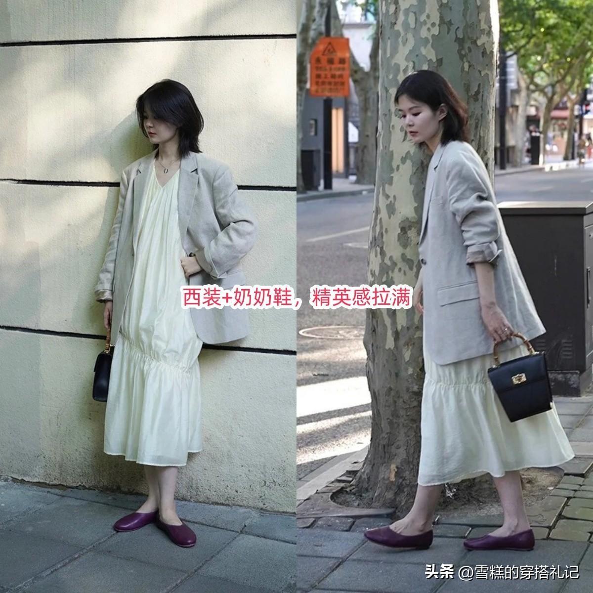 通勤過程中最常穿的肯定就是西裝襯衫了。用它搭配一些純色的連衣裙,不知不覺就會產生簡約高級的味道。同時咱們不妨加一雙深色的“奶奶鞋”幫助點綴,尤其能在淺色的服裝裏製造出色彩沉澱效果,如此上淺下深上寬下緊的對比就會特別強烈。