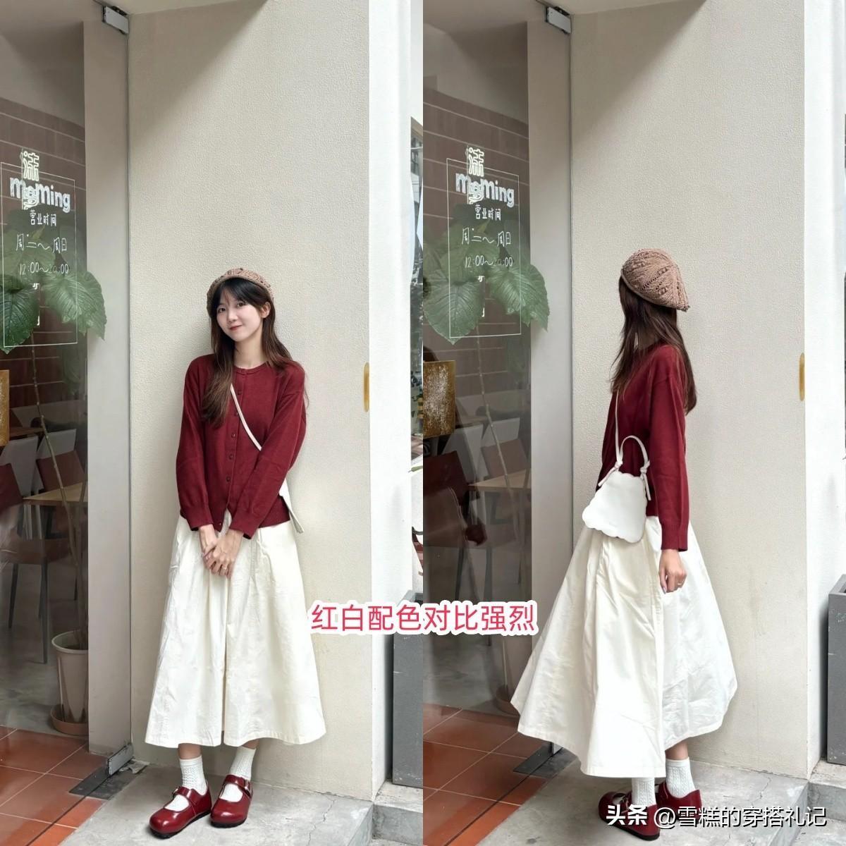 與此配合的紅色針織上衣完美融入其中,衣鞋呼應完整感最佳。此時裙襬還有效的擔當起了造型承接和留白的效果,加深整體個造型的活力感。