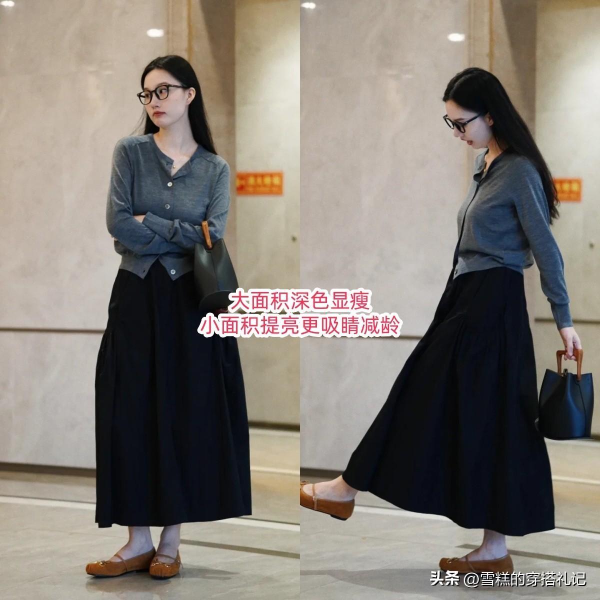 ③長度選擇調整比例:裙子的長度很多時候能決定整體比例的好壞,本身腿就比較短,腿型不夠好看的姐妹一定不要選太短或太長的裙裝,比較適中的是膝蓋以下看,到小腿肚或者腳踝左右的款式。尤其是採用了深色的系列,不僅視覺上達到顯瘦效果,更幫助拉高了造型。