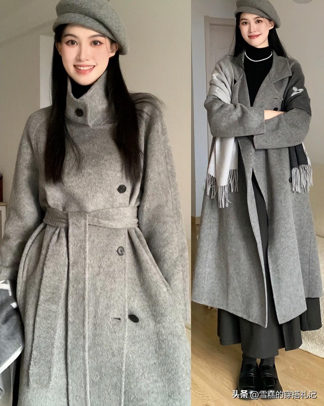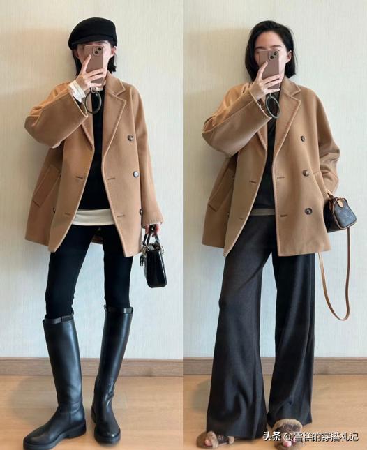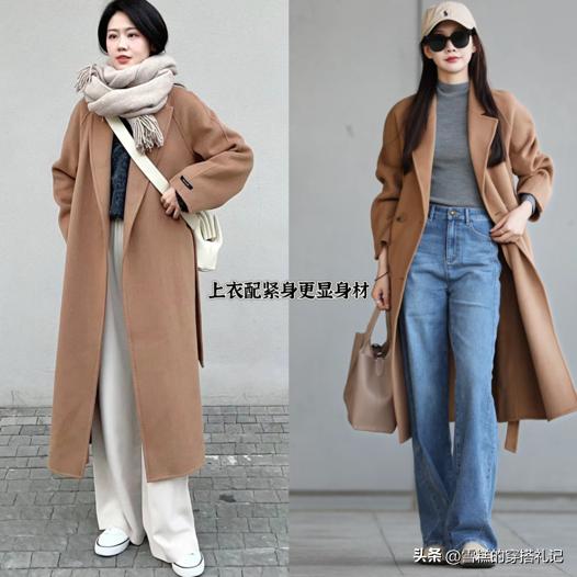 要選對大衣的長度,從兩個維度出發,一個是短款位置剛好沒過臀部的長度,它對小個子非常友好,上身後下半身有足夠修飾空間,內搭做好腰身的突出,就能做到顯高的效果,這種長度也能遮蓋臀肥的問題。