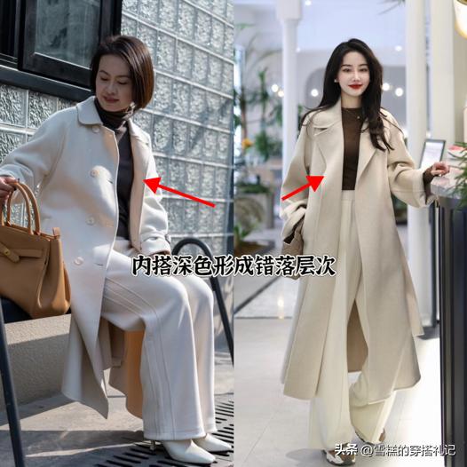 要更顯年輕視覺上有亮眼的感覺,就選米白色的大衣,它是比起駝色更淺的色系,屬於白色調的一種,但是白色生又帶點黃調,減少了白色視覺上的亮眼感。這種顏色上身就能給人清爽乾淨的效果。讓中年女人的穿搭顯得更加年輕。建議米白色大衣搭配顏色時有深淺的對比,內搭深色的,上衣會避免視覺的膨脹感,有更顯瘦的效果。