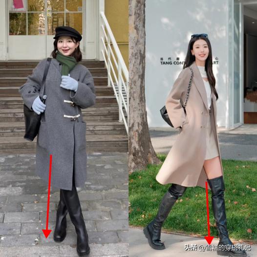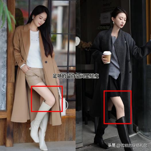 大衣的下裝想要更潮流,可以解鎖一款當下流行的新穿法,也就是短下裝配長靴穿,這種會更強調腿部線條,它能營造出酷拽和小性感,讓視覺的衝擊感更強烈。鞋子都要選擇到膝蓋位置的長度,個子高可以選擇過膝款式,個子矮的女生選擇膝下款式。靴子配短下裝要形成流暢的線條,這樣腿型不直的女人也可以放心大膽穿。