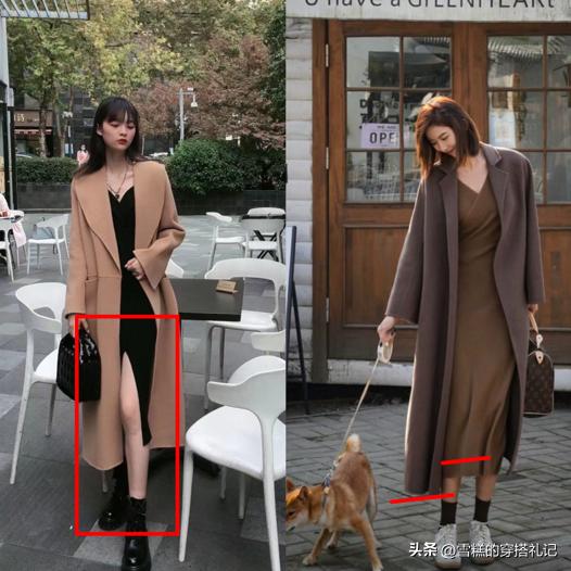 大衣和連衣裙的搭配切記不要顯得太死板,這種死板就體現在裙子和大衣長度,忌諱大衣和連衣裙同長度會顯得非常的呆板,不自然,正確的方式是有着長短的錯落層次,要麼就是大衣長於連衣裙,要麼就是連衣裙長於大衣。其次大衣會要敞開穿,連衣裙的長度過長,可以加入開叉設計,能修飾出更修長的腿部,增添女人味。