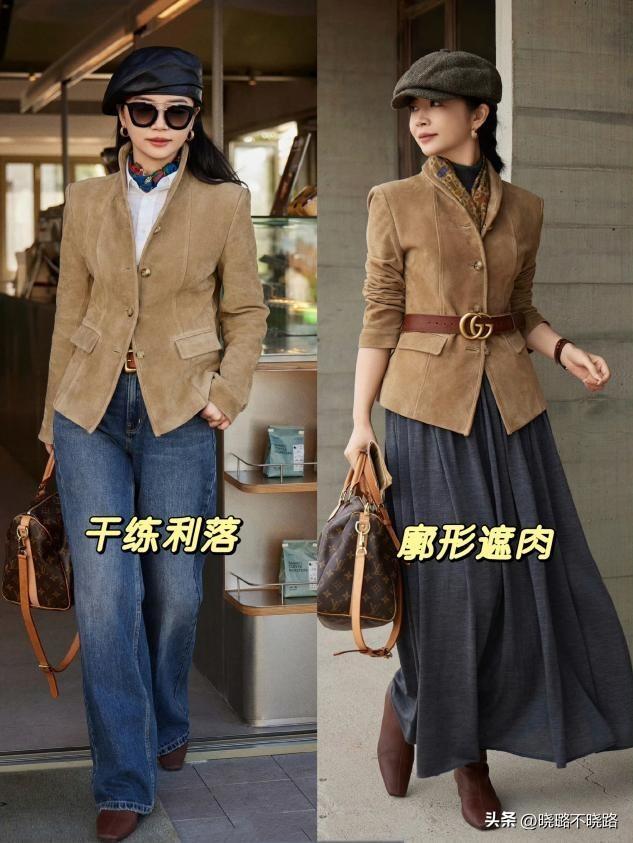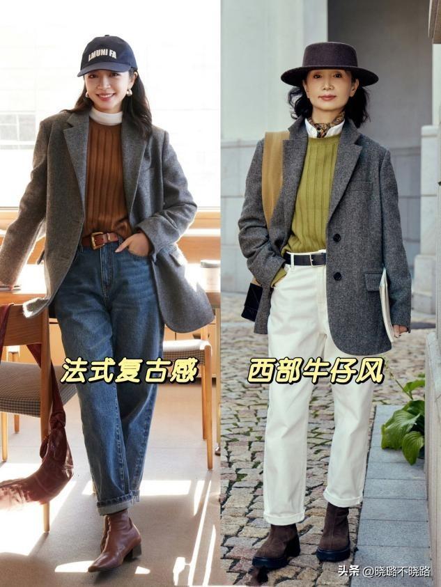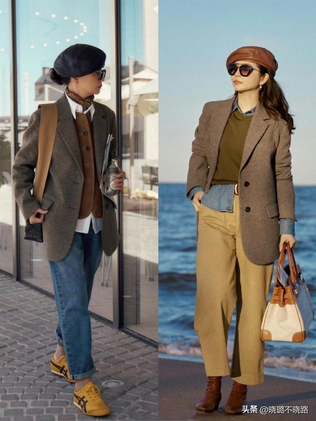 秋冬季節不要選擇太長太寬鬆的西裝或者大衣,對於小個子不友好,分分鐘顯矮顯胖,跟着三木博主穿這種齊腰或者剛好蓋住臀部的西裝外套效果會更好一些。下面配上直筒的牛仔褲,整個人都非常的清爽幹練,在棕色與藍色的配合下,增加了一絲絲的復古感。如果腿型不夠好看,配上闊擺的半身裙也可以,但是記得蓋住小腿的長度更得體,休閒風多一些的毛呢西裝瞬間穿出了精緻與優雅。