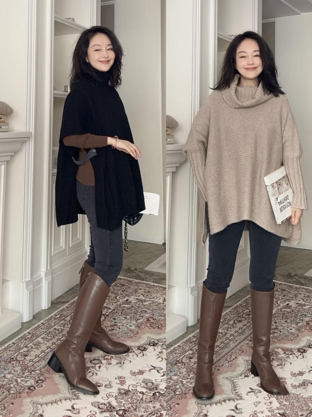 秋冬季節,一件高領的毛衣,可以選擇寬鬆度斗篷風設計、或者是蝙蝠袖的款式。看似基礎的毛衣,瞬間變得洋氣起來。
