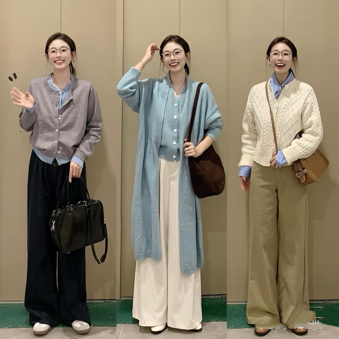 針織開衫疊搭牛仔襯衫,配上黑色直筒西裝褲,這種簡潔又清爽的美,也太惹眼了。黑色的直筒西裝褲,很大氣、也很高級,顯瘦還顯高。