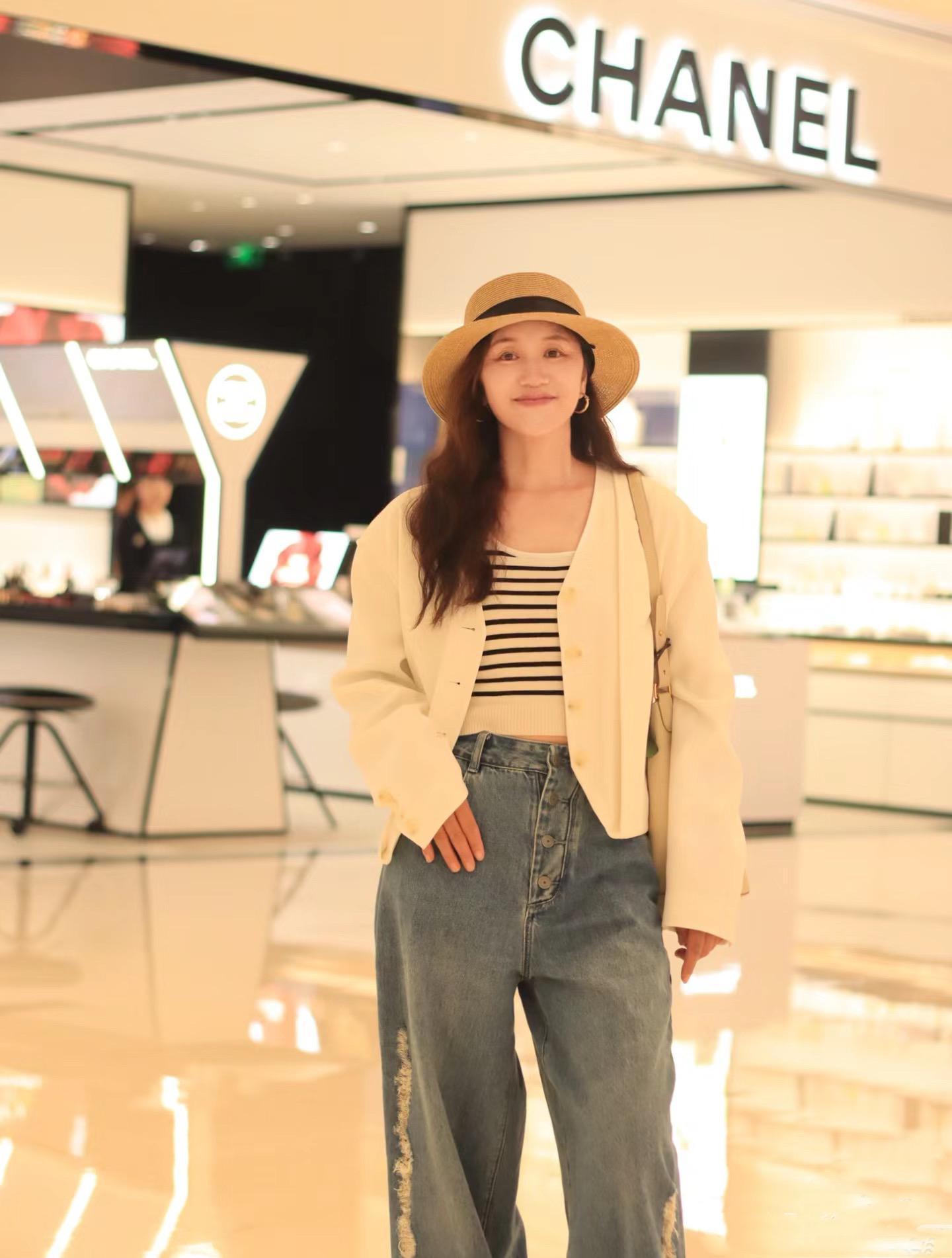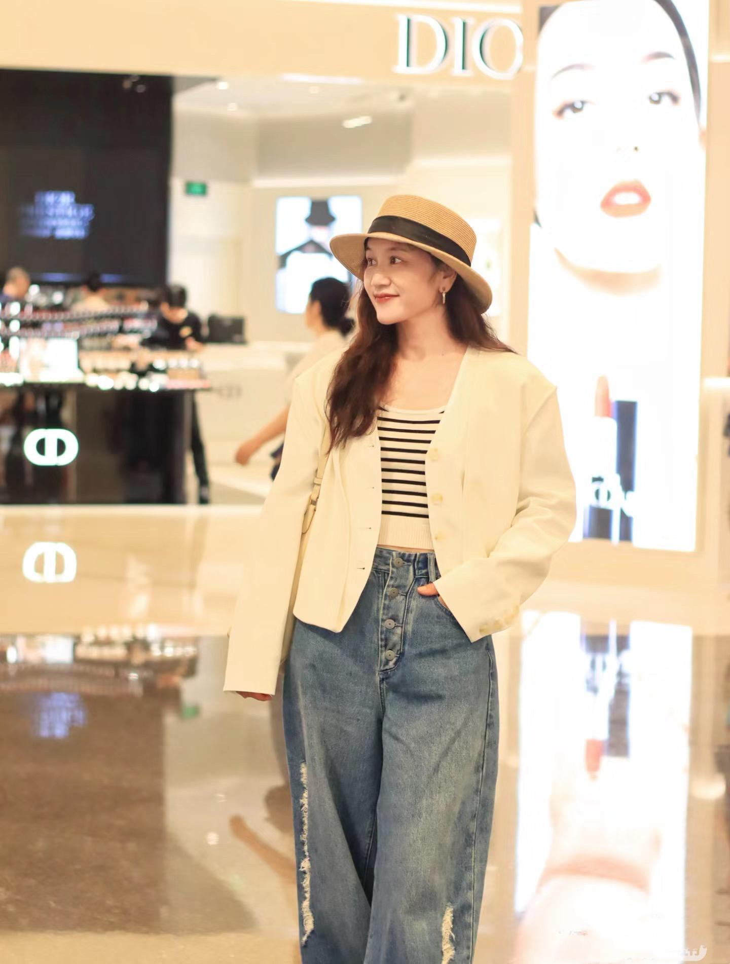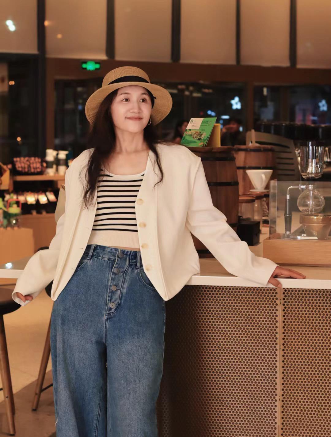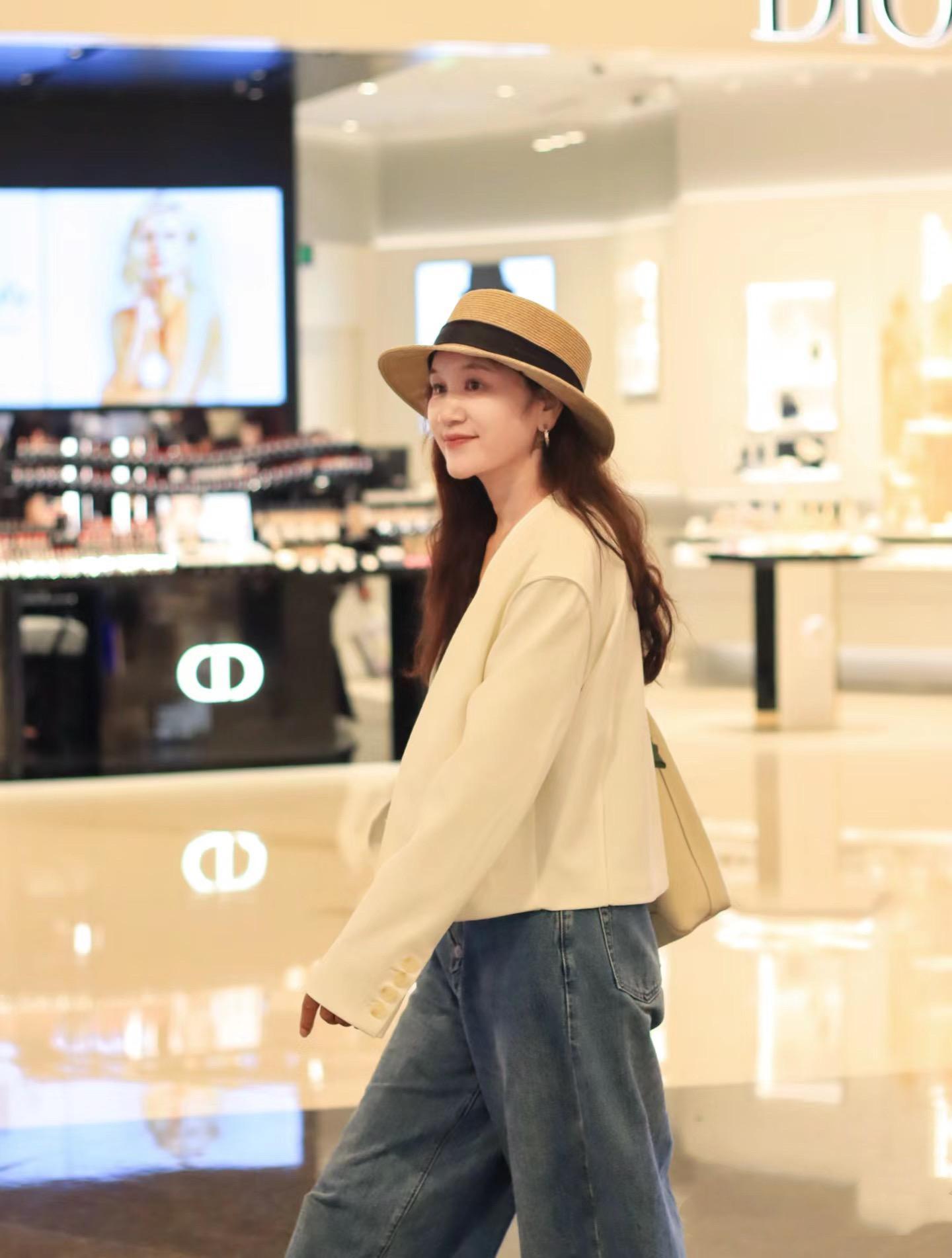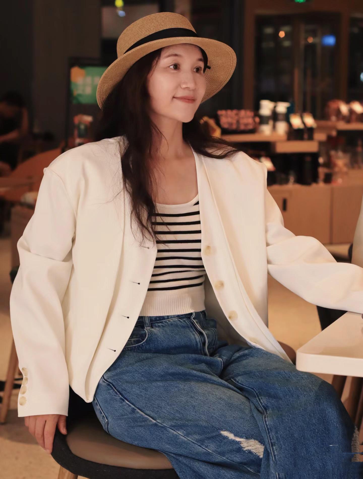 就像這件寬鬆的白色小外套,我就覺得非常適合我,V領的剪裁,能把我的脖頸線條顯得更修長。
