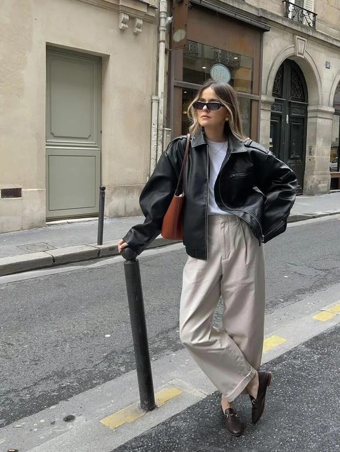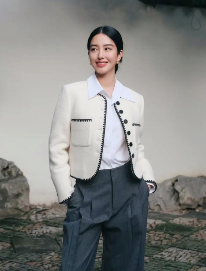 短款的小香風外套,不正是專屬於小個子女性的嘛,可以讓你穿出帥氣和魅力,也不失個人氣質,搭配灰色闊腿褲,就會給人一種大女人的氣質,外套裏面配了一件白襯衫,氣質感十足。