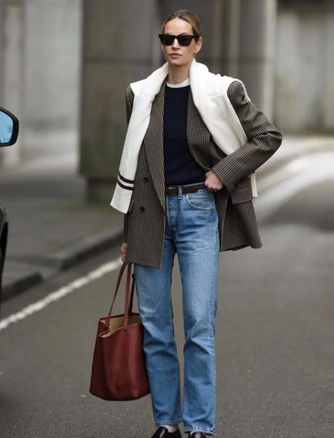 格紋款式的西裝外套,真的是自帶復古氣息的,選擇一條牛仔褲來配,遵循了簡繁組合,能輕鬆打造出層次感,內搭可以進行疊穿,增加層次感的同時,還保證了穿着溫度,讓女性盡顯魅力。