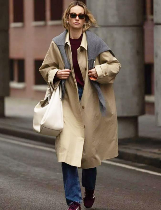 落肩設計的風衣外套,對於身材有着一種很好的包容性,更能讓你散發出一種知性與魅力,利用灰色針織衫作爲披肩點綴,感覺任何一種場合都能應對,也盡顯大女人風氣場。
