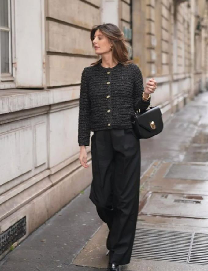 黑色小香風外套,利落的短款,小個子女性能輕鬆打造出高挑感,也讓你的穿搭更颯爽率性,搭配黑色闊腿褲,輕鬆就穿出灑脫感,視覺上一身黑色,瞧着就十分顯瘦。