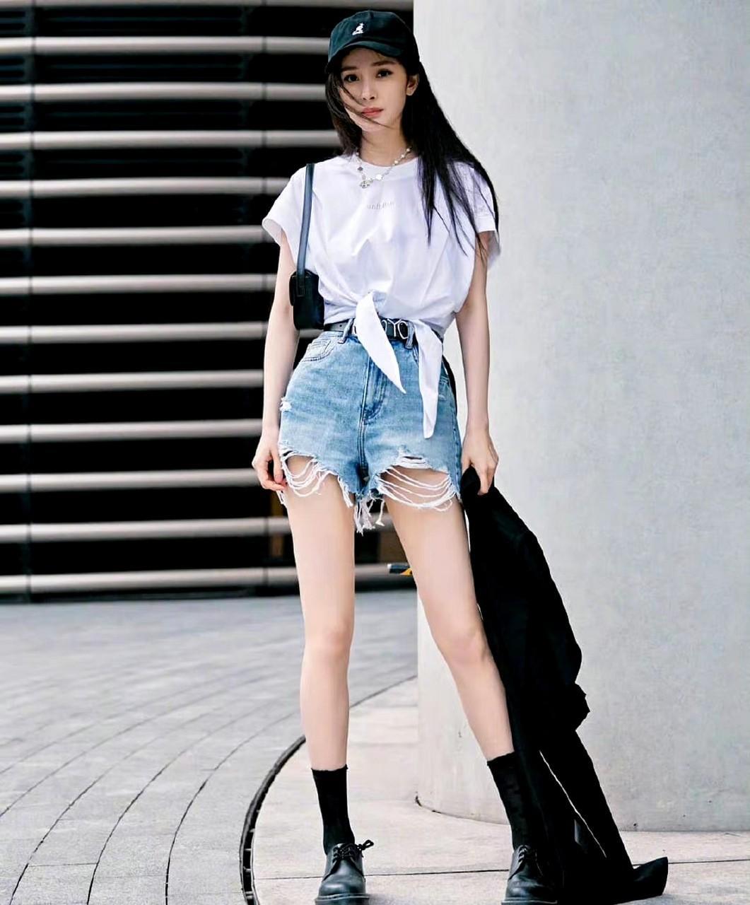 這裏楊冪就爲我們做了很好的示範。她將衣角區域給打一個結,營造出腰線來,下搭破爛的短款牛仔褲,突出大長腿,青春感瞬間襲來。腳踩平跟馬丁靴,有一種街頭少女的既視感,這樣的穿搭簡約毫無難度,現在就可以GET住。