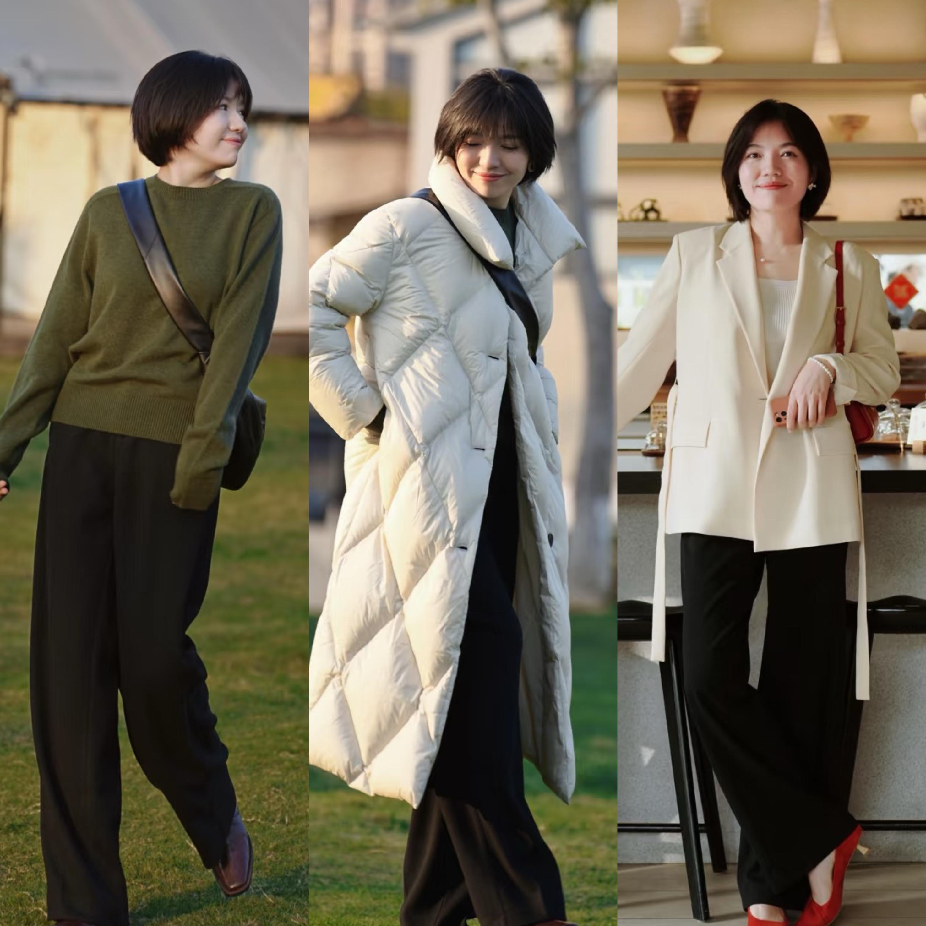 白色針織衫+黑色直筒褲,或者焦糖色羽絨服+白色闊腿褲,都屬於層次清晰的搭配,上下比例切割很明顯,比例感優越。