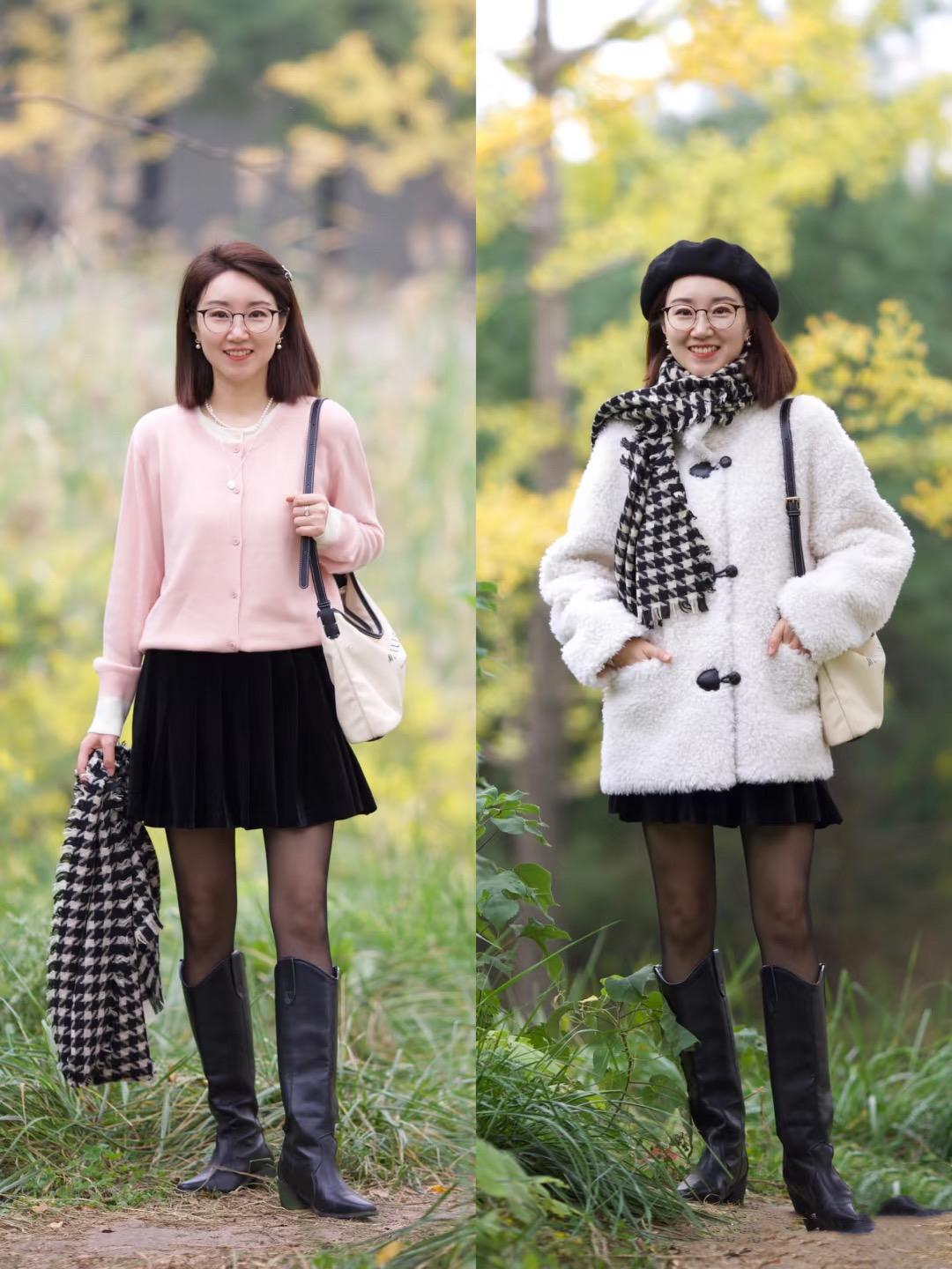 對於小個子博主來講,秋冬的季節更應該多穿着線條流暢的服裝。比如H型剪裁的羊羔絨外套、V口的長靴、A字形的短裙等。