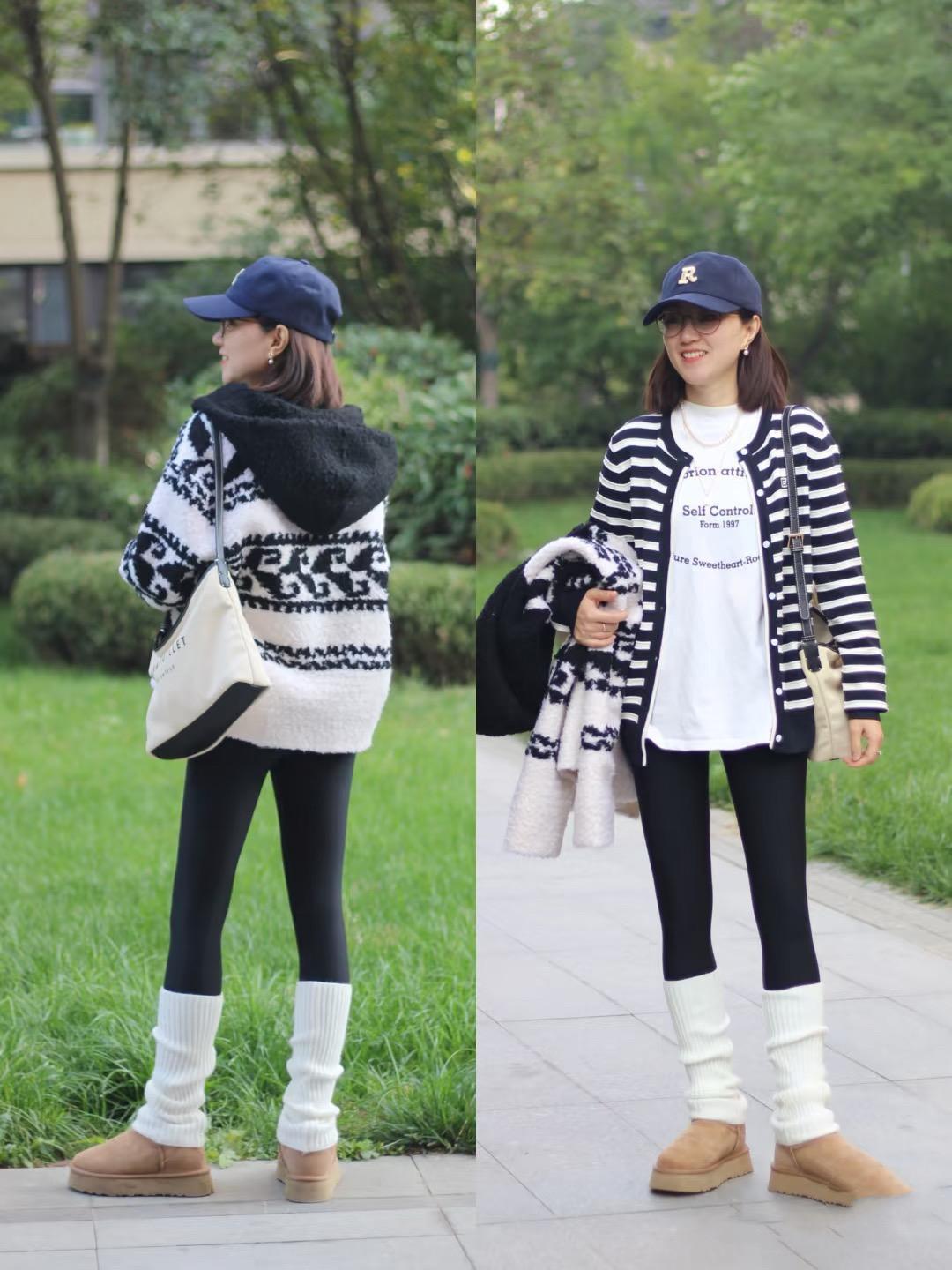 這種上松下緊的打扮,寬鬆條紋開衫,配上鯊魚褲,顯得雙腿又細又直。天冷的時候,鯊魚褲還可以配中筒襪來穿,打造層次感又保暖。