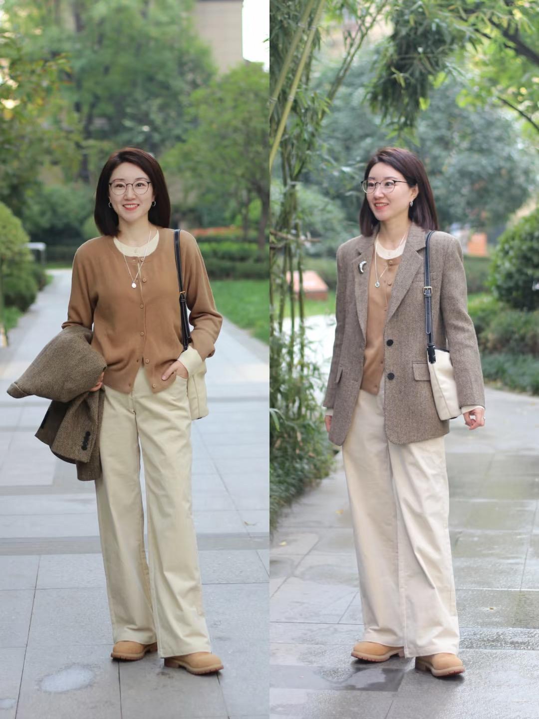 像這種針織開衫,可以配直筒的長褲來穿着,針織開衫稍微寬鬆的版型,搭配淺卡其色的直筒褲,有一種很溫柔大氣、又特別顯高的效果。