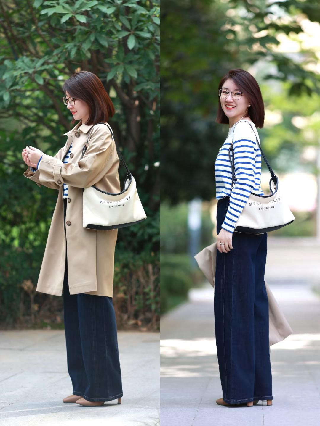 比如經典又耐看的條紋打底衫,配上直筒的深藍色牛仔褲。牛仔褲與條紋衫,色彩上形成了呼應,這種簡潔又高級的美,特別耐看。