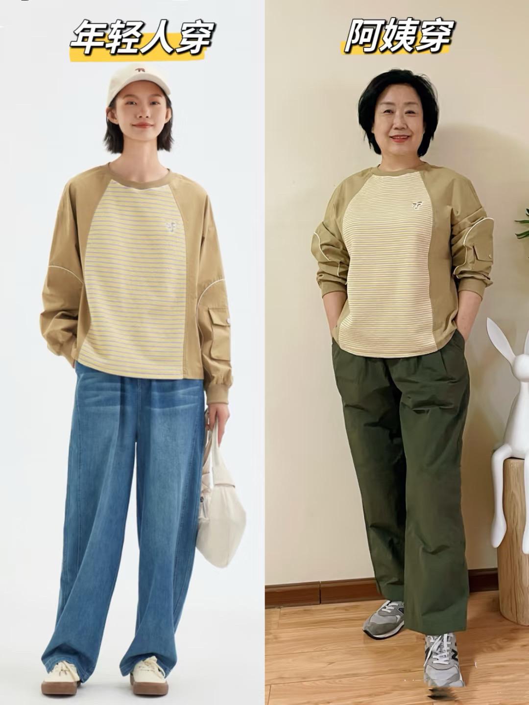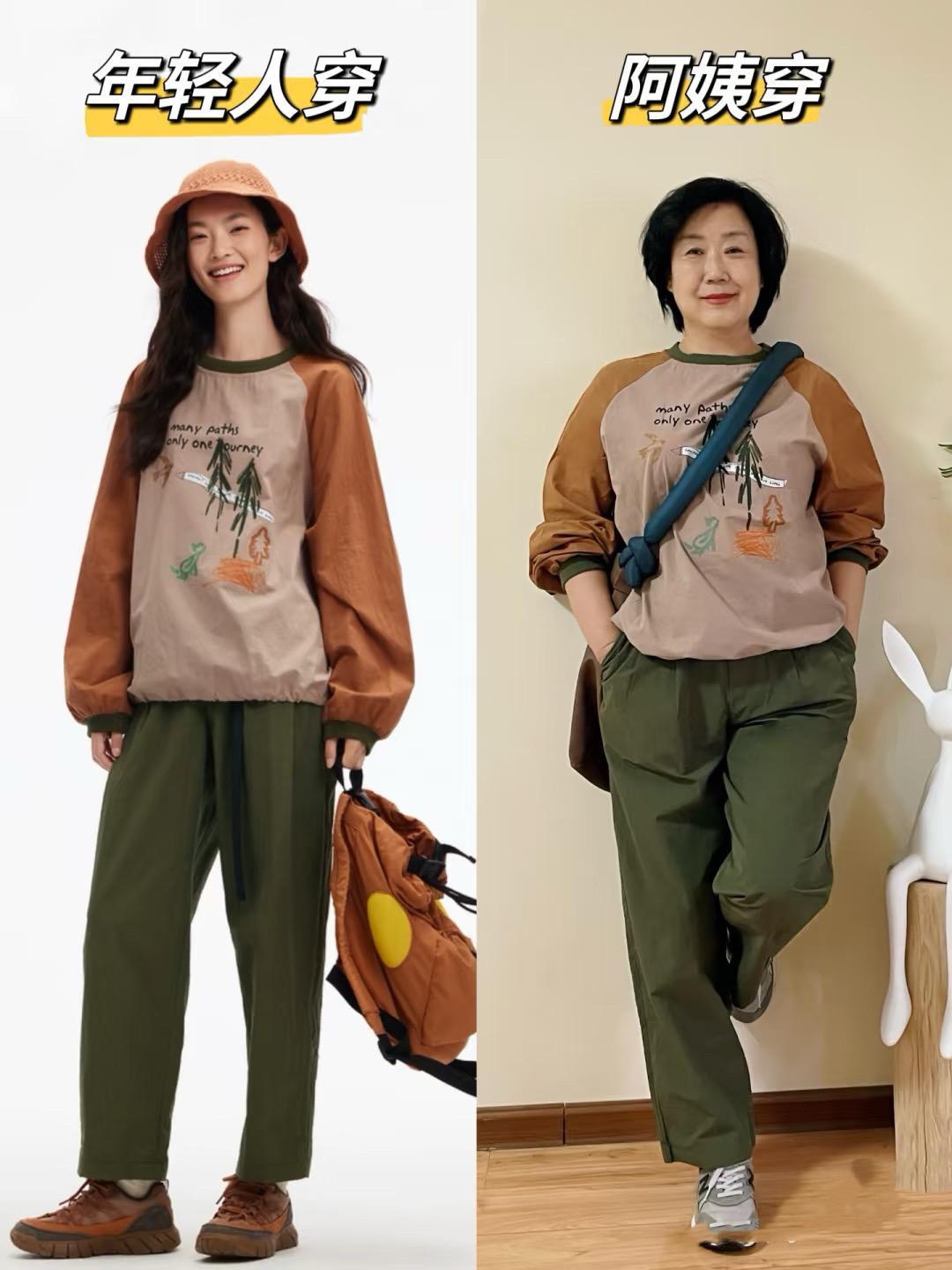撞色的上衣,配色很清新、是一種比較大方的美。可以搭配軍綠色的直筒褲、運動鞋,掩蓋大齡女性的歲月感,直筒褲+運動鞋也很顯年輕、特別舒適。