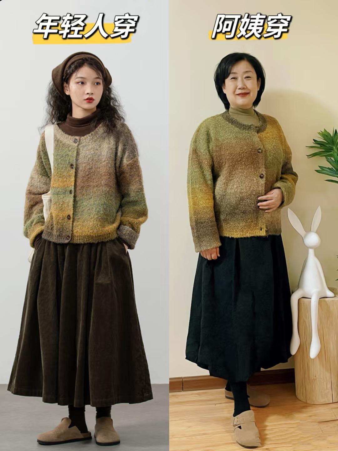 像這種復古風+美拉德的組合,在秋天裏穿真的很有意境。這種半高領的上衣,配上漸變色的開衫,那麼多溫柔又柔和。