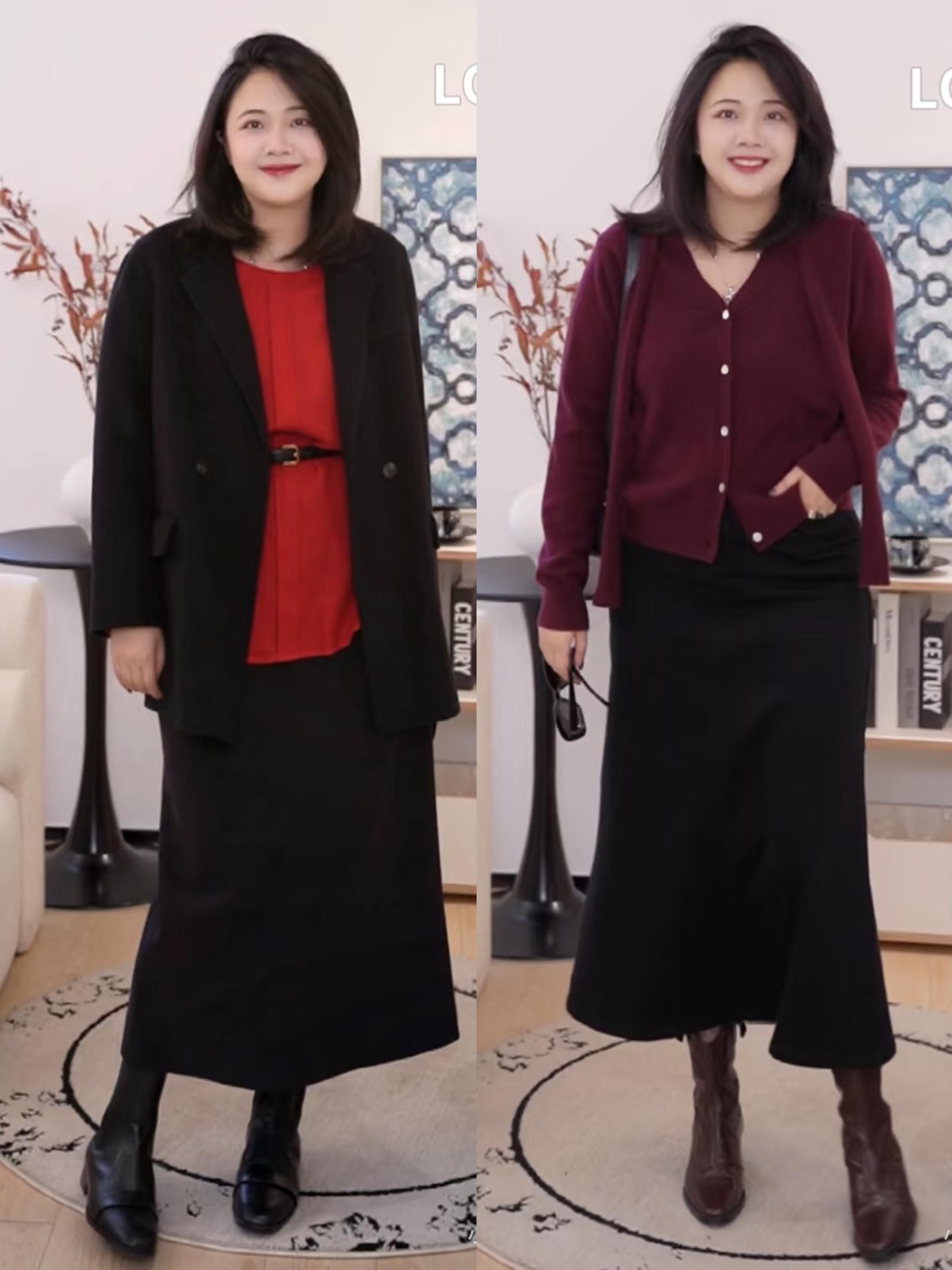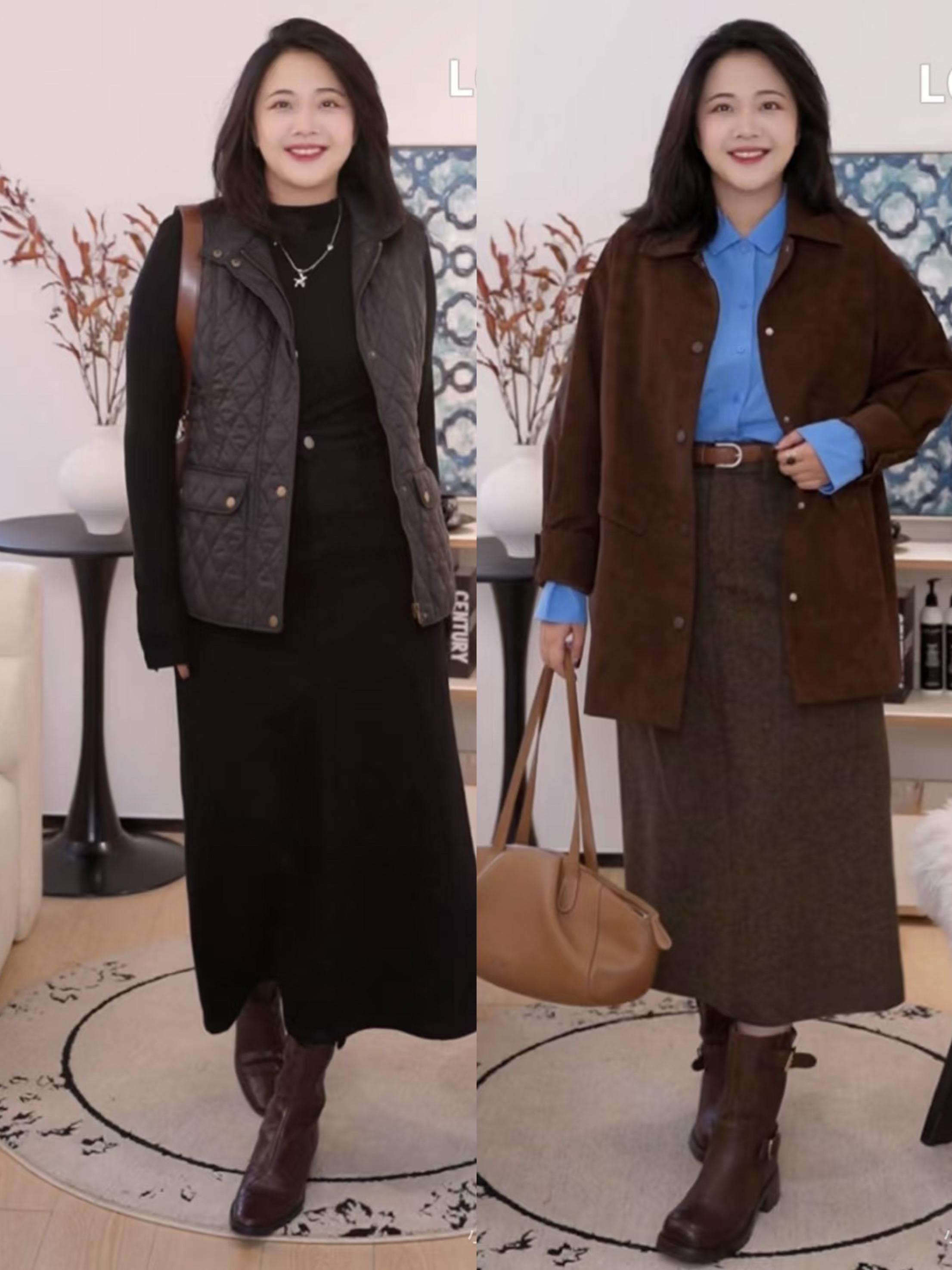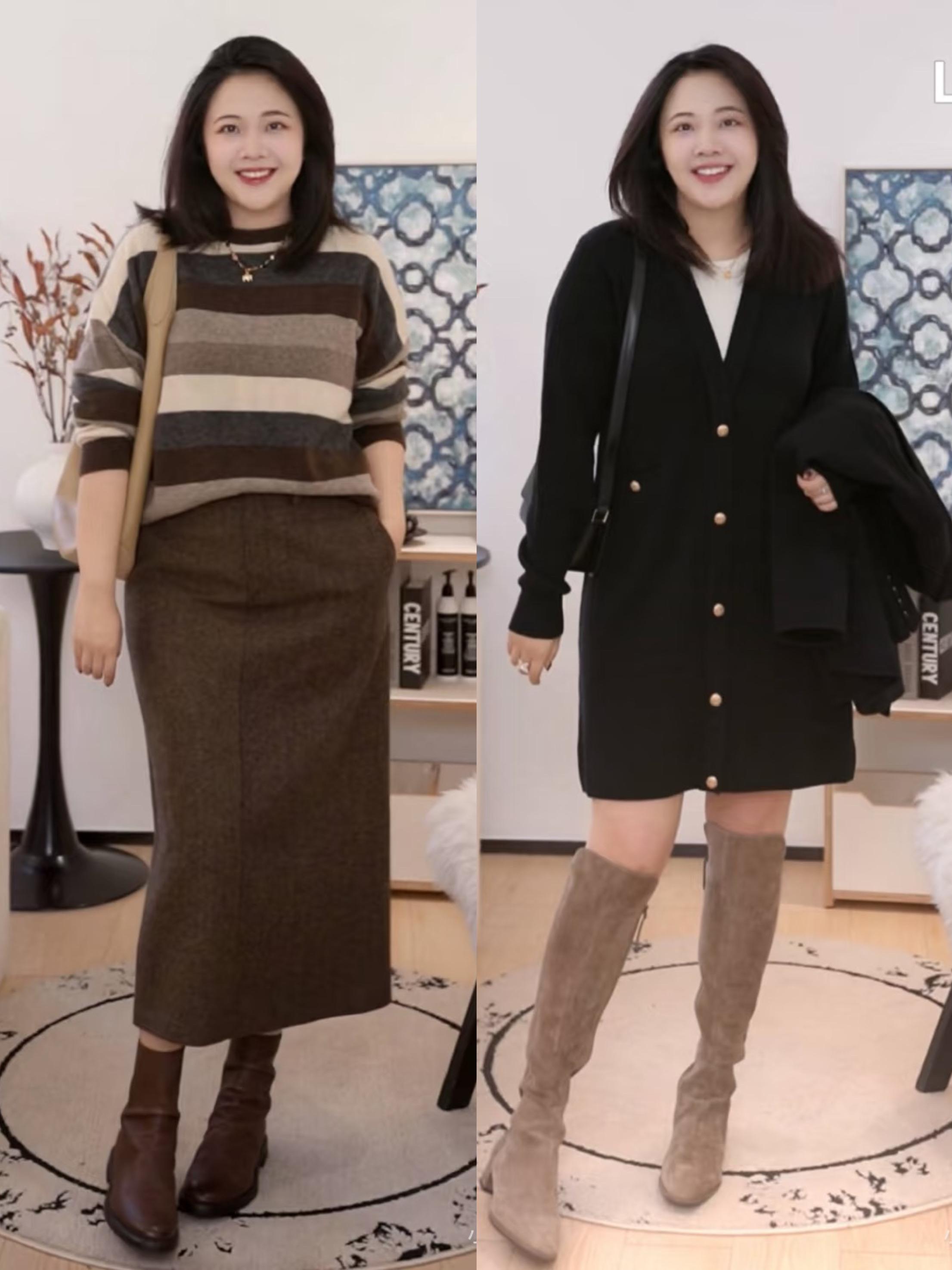 比如秋冬季節的西裝套裙、或者半身裙,搭配長靴/短靴,自然露出小腿或者大腿的線條,都讓低調的穿搭變得更時髦洋氣。