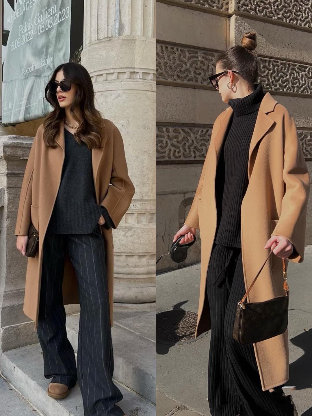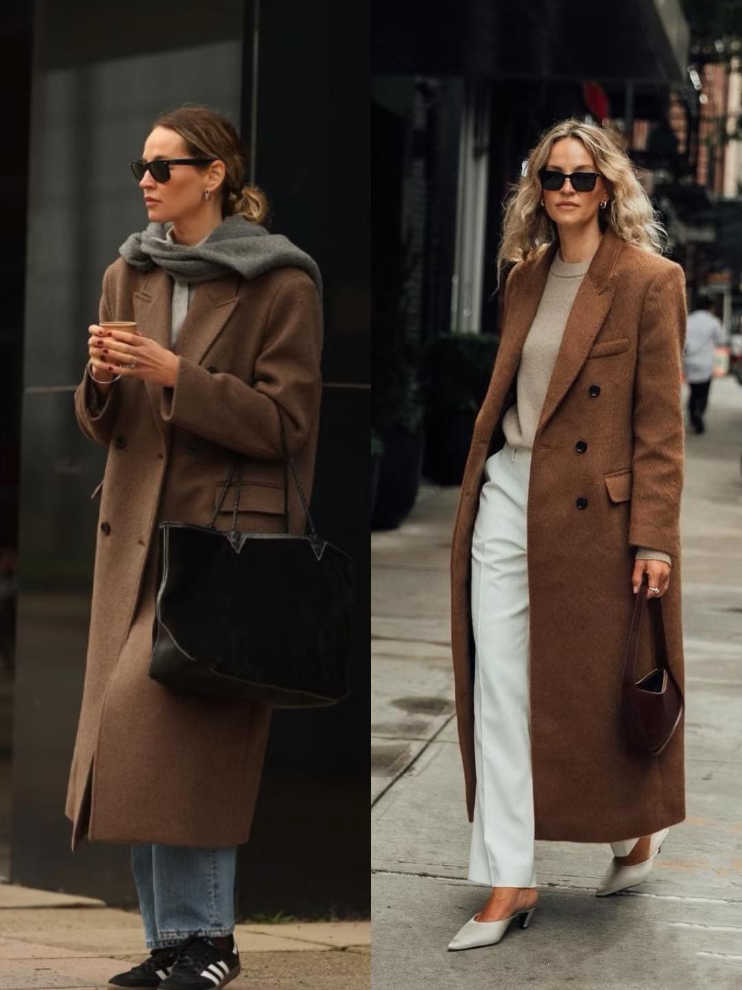 基礎款的駝色大衣,可以配挺括的高腰直筒褲