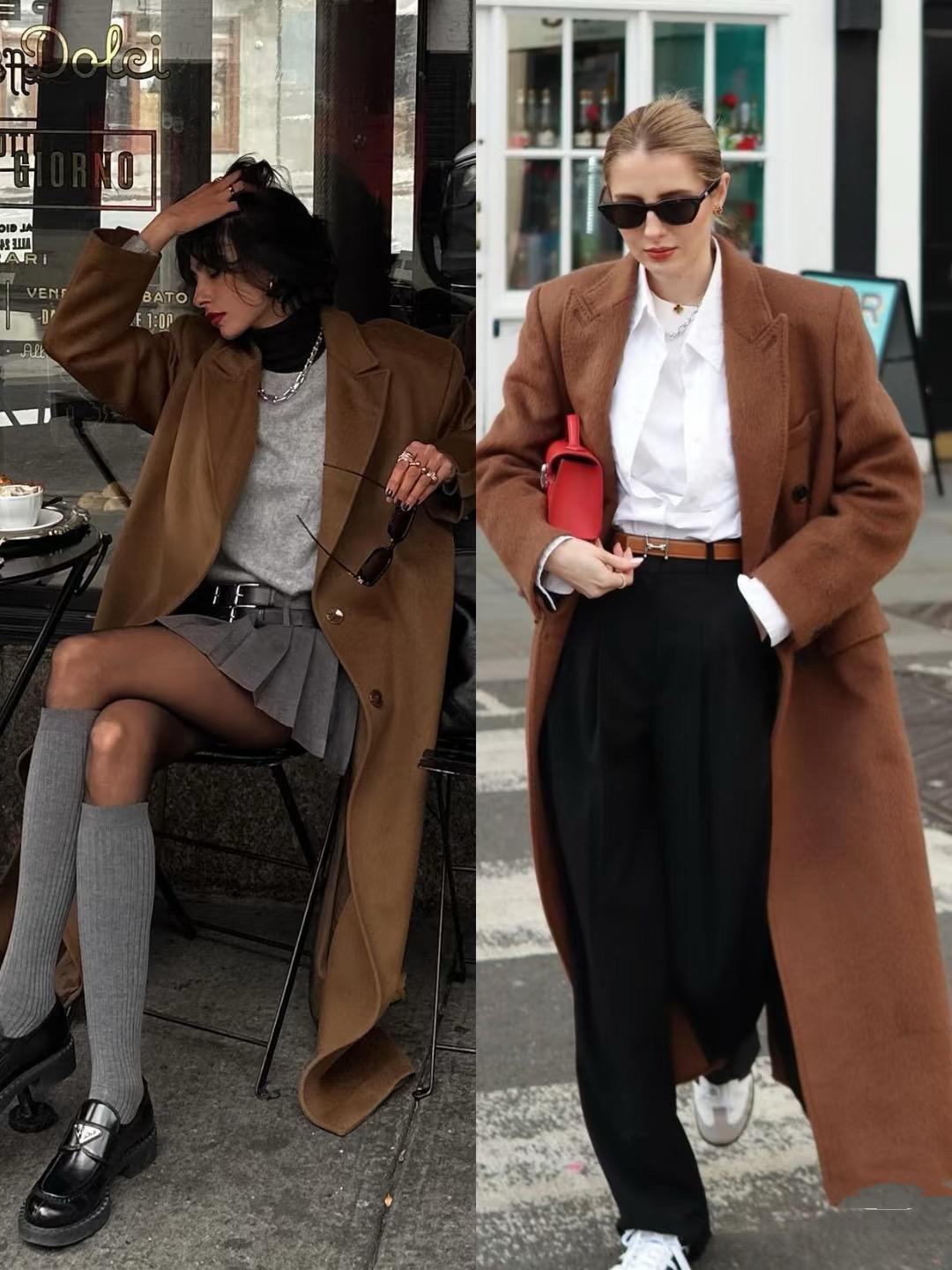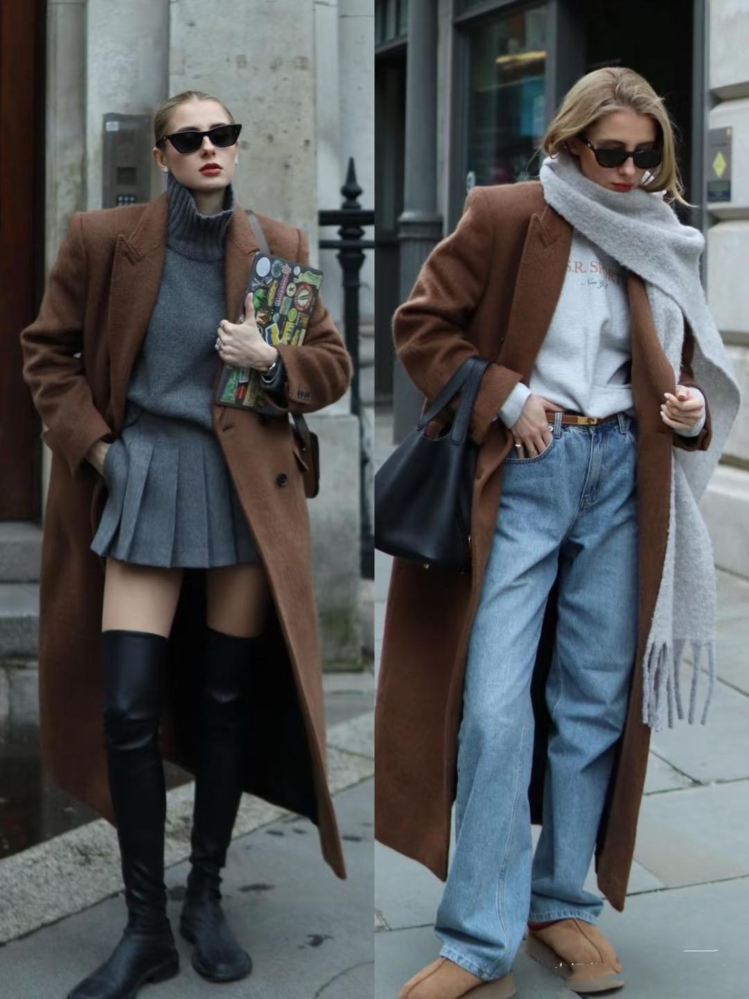 駝色大衣,可以有大女人的氣場、也可以有小女生的精緻。當我們穿着駝色大衣的時候,可以配超短的百褶裙,顯得雙腿纖細苗條。