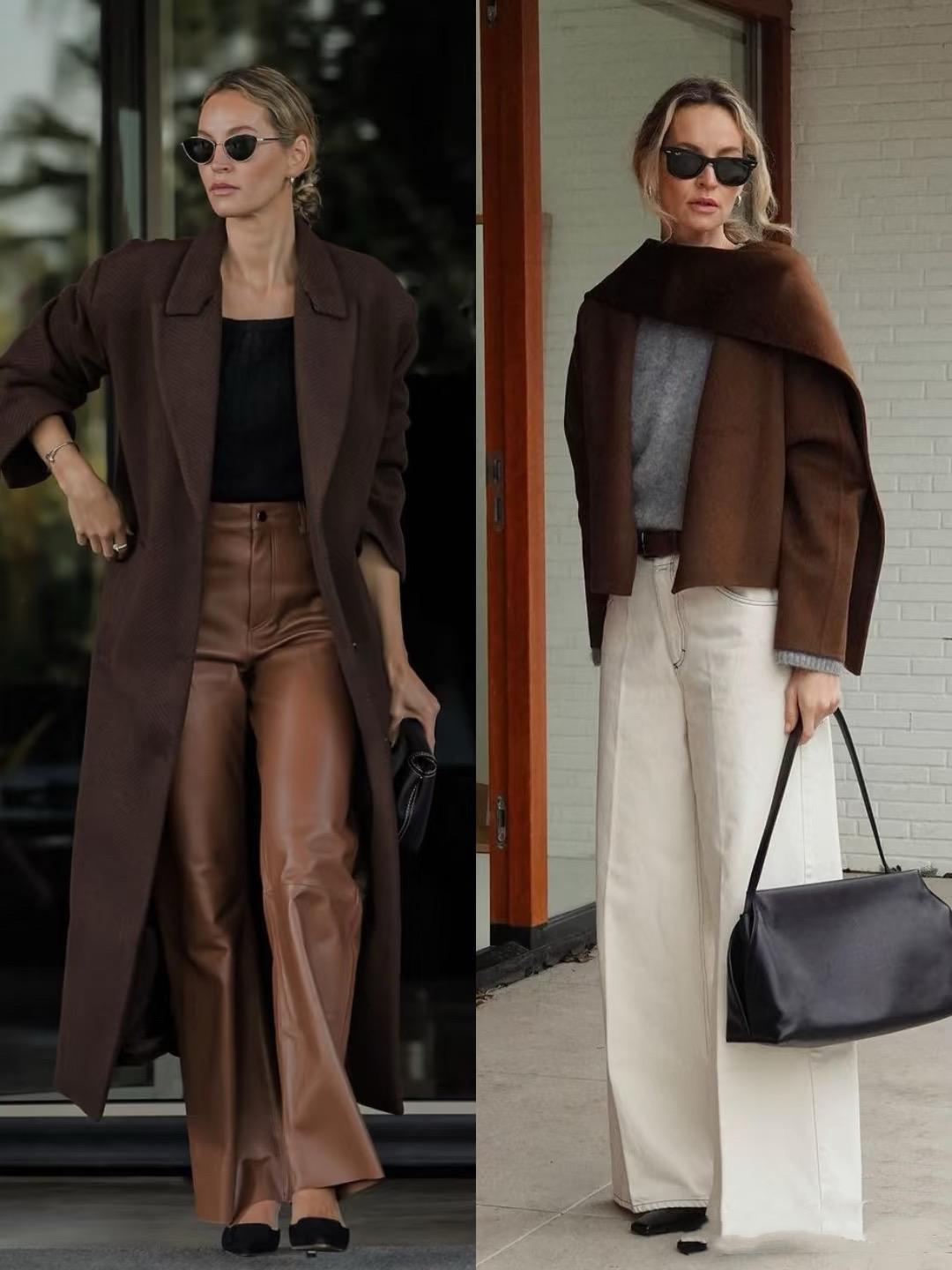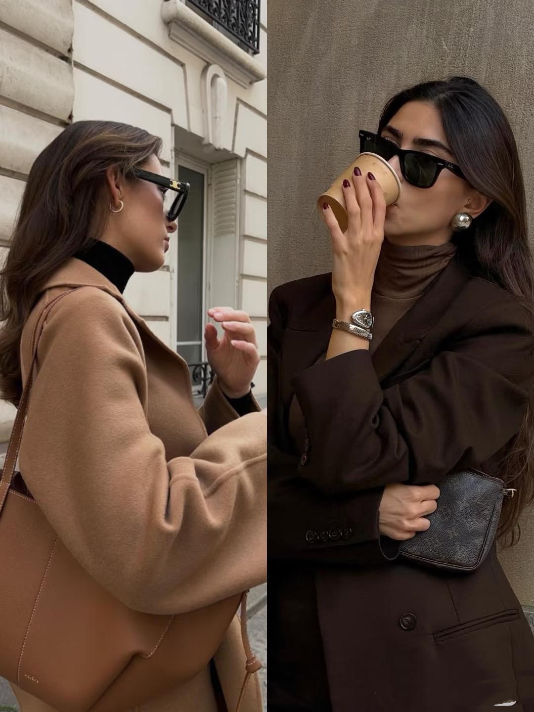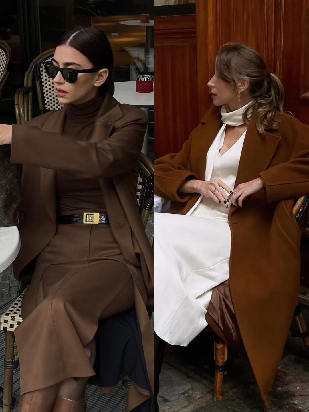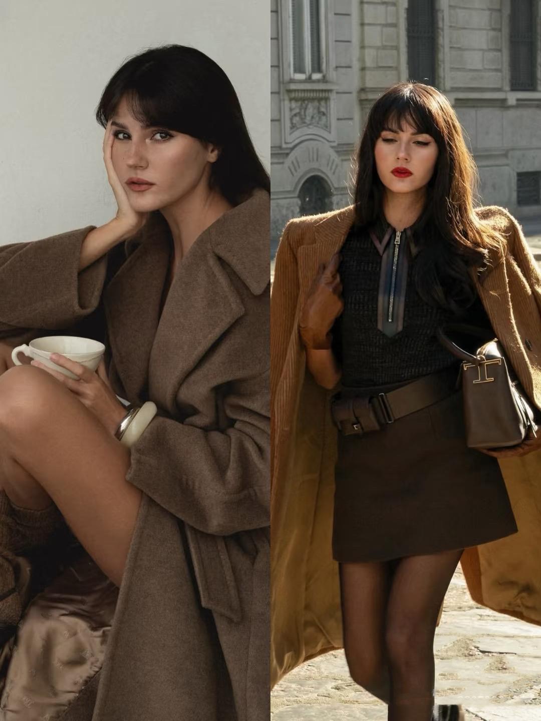 深駝色、或者棕色系的大衣,比較低調、也很容易湮沒在人羣裏。如果不在搭配上下功夫,真的很難穿出屬於自己的時尚氛圍。
