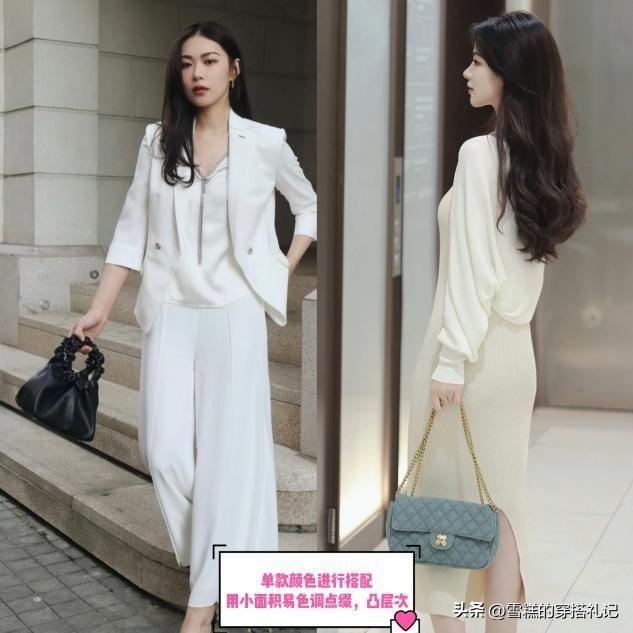 在與其他的色系進行組合的時候,最好能夠在視覺上體現出來一定的分割感,尤其是上下系列,這樣的搭配標準的比例線是一定要展現出來的,因爲這一款顏色的穿搭一定要呈現很高級利落的視覺狀態,這一個還是比較重點的喲,大家在搭配的時候記得碼住。
