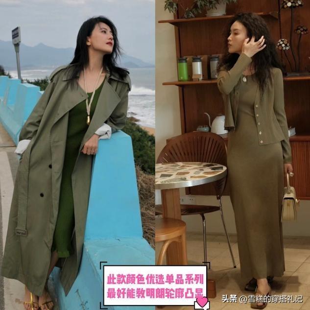 這款色系的單品其實就比較推薦大家最好能夠使其單穿出現。例如像長款的連衣裙又或者是風衣以及長款的大衣,這樣的搭配襯托出來的整個氣質狀態就有着很明顯又和諧又優雅的感覺,本身這一款顏色百搭性還是比較強的,所以在入選單品系列的時候只要能夠展現我們身形和氣質的優勢,放心入手吧。