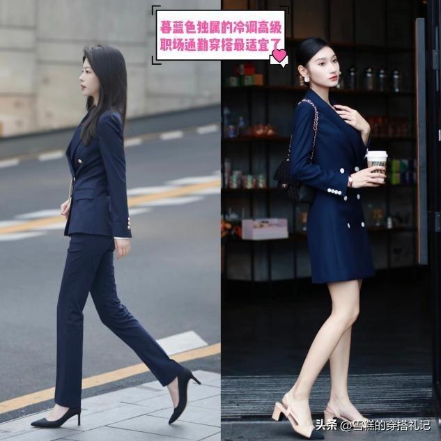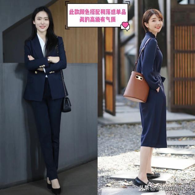 暮藍色搭配真的非常的適合應用於職場當中,尤其是對於中年階段的女性而言,這樣的西裝套裝或者是很利落的單品進行搭配的話,給出來的感覺就是特別直觀的利落和高級,在這個時候也記得搭配一些比較簡約大氣的配飾,增強我們本身的氣質。