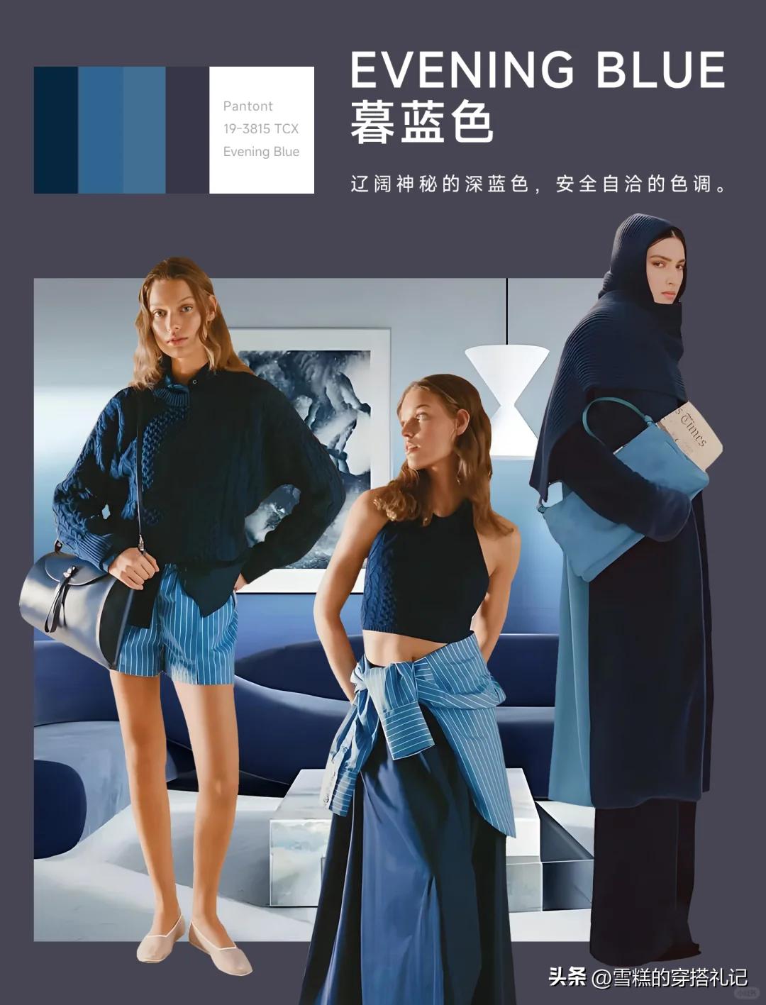 第1款顏色,它還是屬於藍色調當中比較偏深色飽和度也較低的類型,所以在搭配下來的時候,不管是對肌膚的狀態還是身形以及年齡階段都沒有任何的限制,大家可以放心的去進行優選搭配。在當下這個秋季的階段搭配起來的時候冷調性還是比較高的,很容易凸顯出來高級的氣質。
