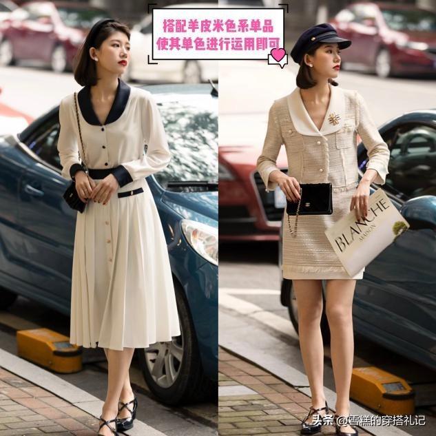 羊皮米色其實在單色進行運用的時候襯托出來的氣質優雅又溫柔,但如果我們自上而下,從裏到外都是這一款顏色的話,難免也會有一定的單調性,所以建議大家可以搭配一些包包或者腰帶以及鞋子這種小面積的配飾,尤其是像帽子這種,其實就可以運用對比色或者是一些比較穩定的彩色系作爲其中的點綴。