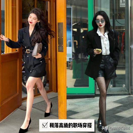 西裝這一款單品所襯托出來的視覺狀態和氣質就比較的偏向於利落又高級了。這個時候推薦大家可以搭配高跟鞋這樣的元素,而且一定要運用比較基礎的顏色例如像黑白灰或者是大地色系,比較適合職場通勤的時候應用。