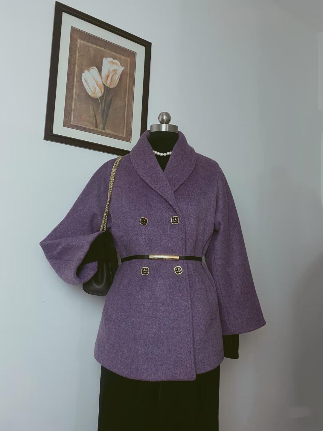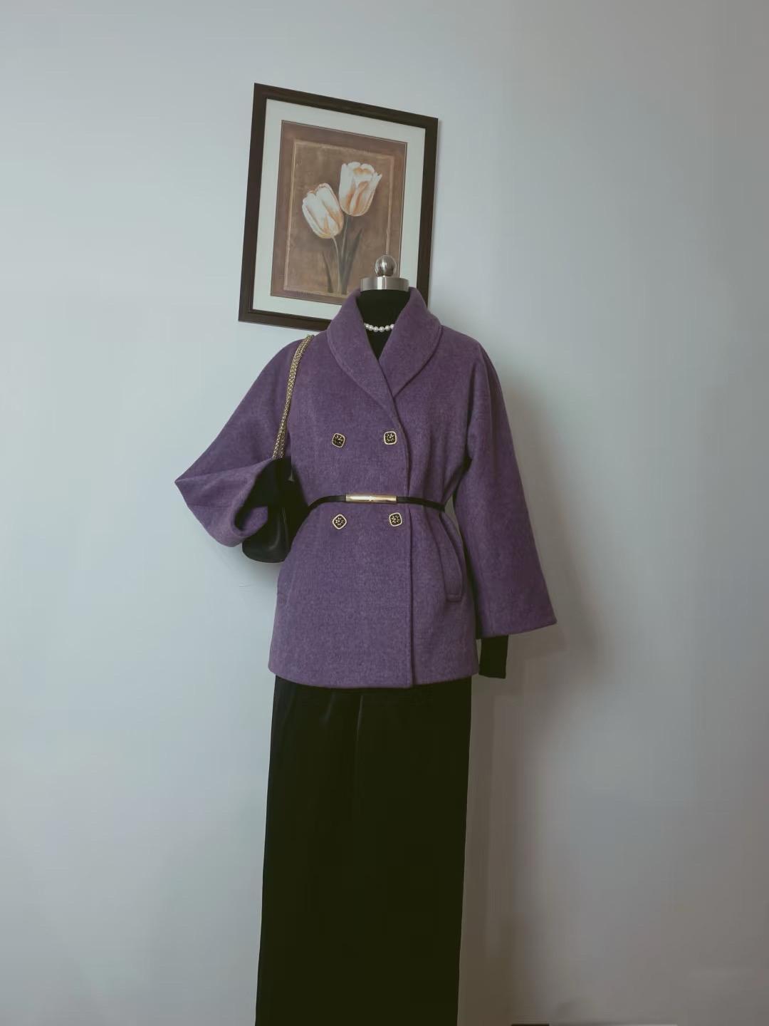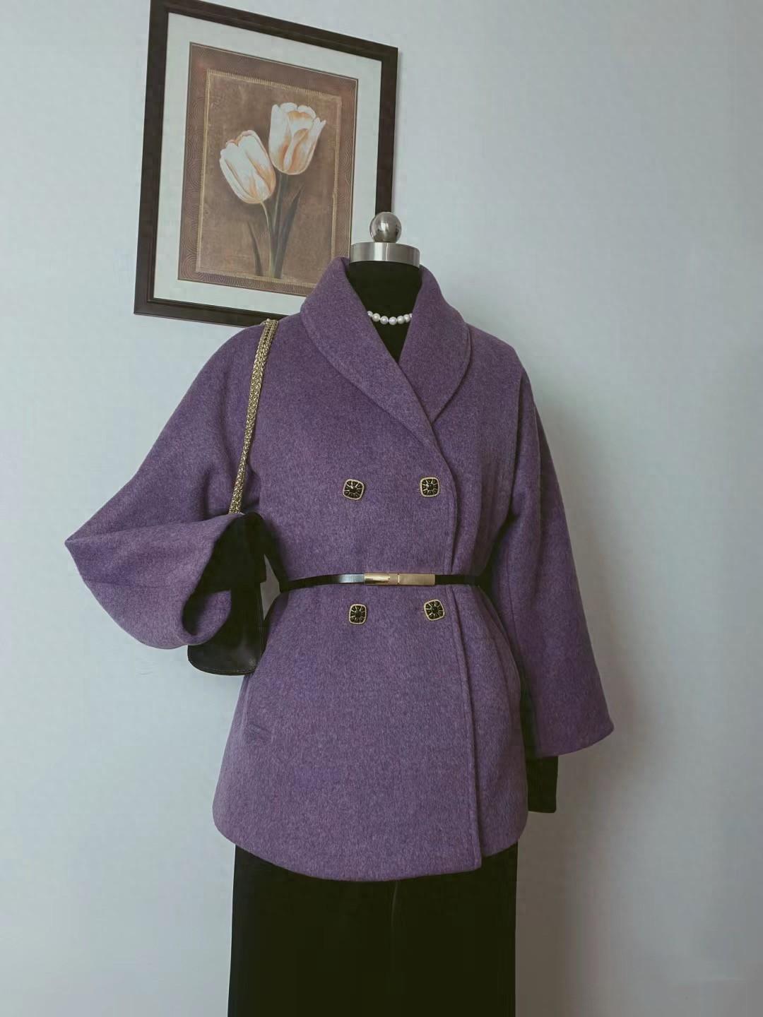 憑藉印象回想了一下,就是一件深紫色的呢子大衣,雙排扣、配了黑色皮帶、下襬有點寬鬆,屬於微張的款式。