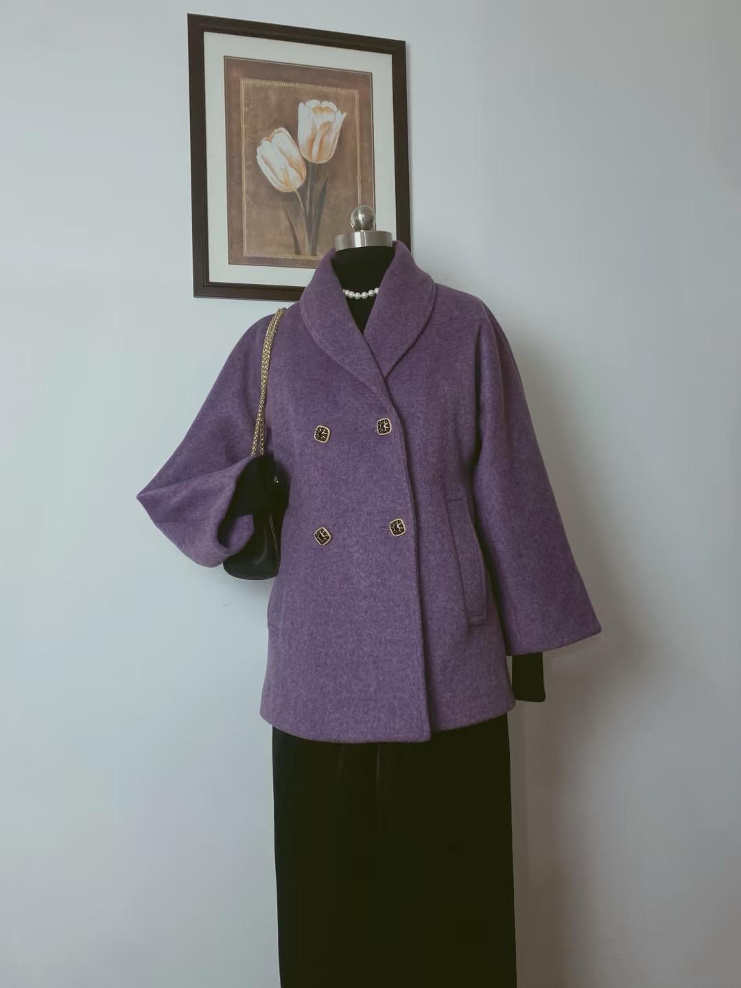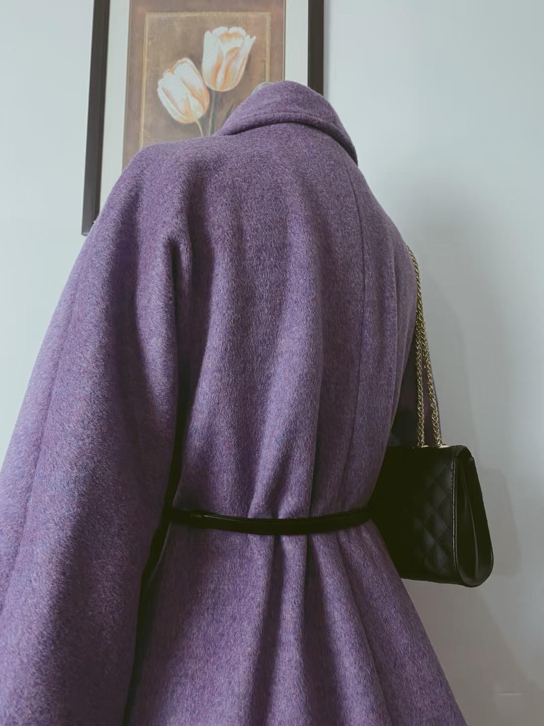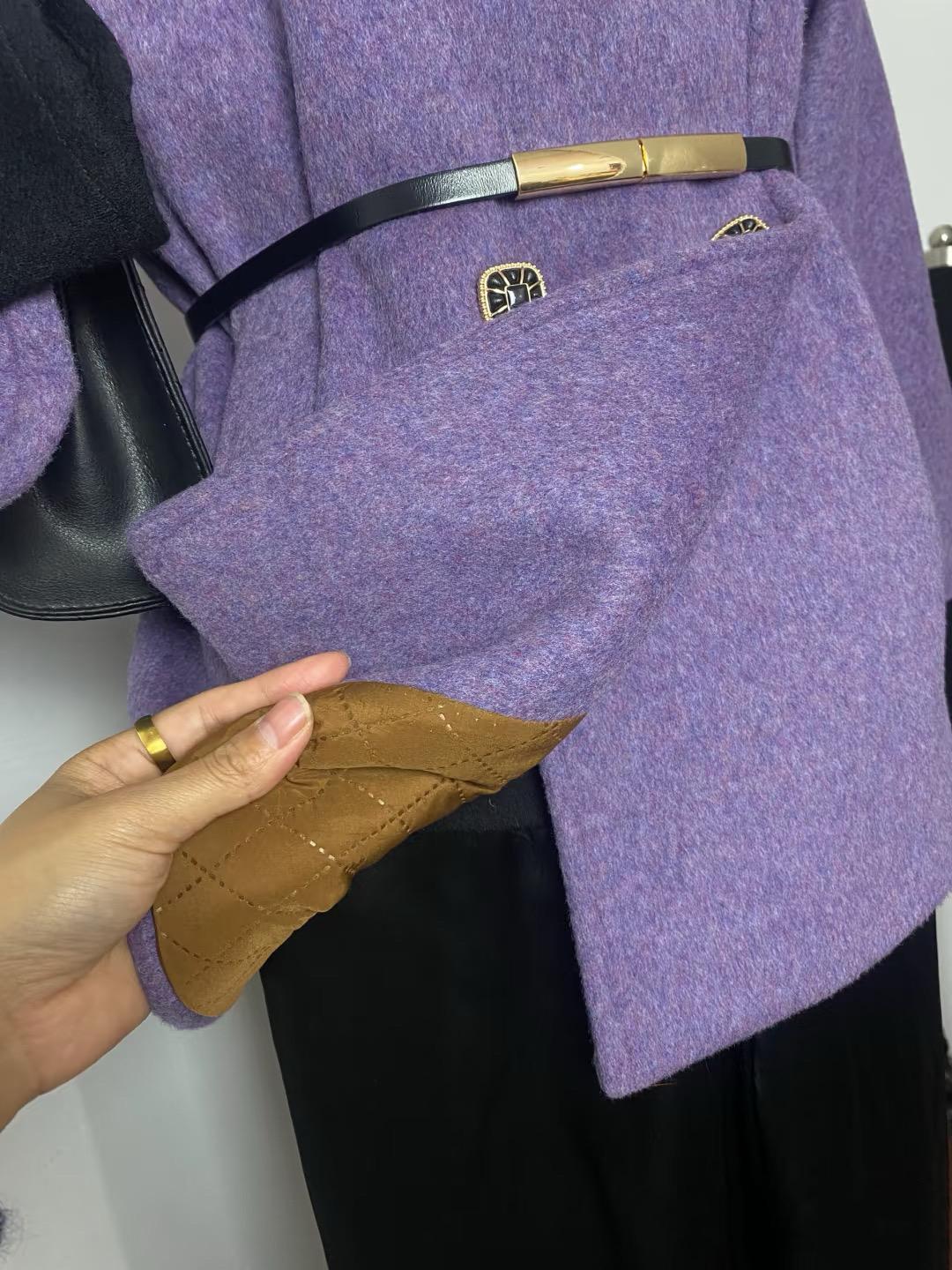 憑藉印象回想了一下,就是一件深紫色的呢子大衣,雙排扣、配了黑色皮帶、下襬有點寬鬆,屬於微張的款式。
